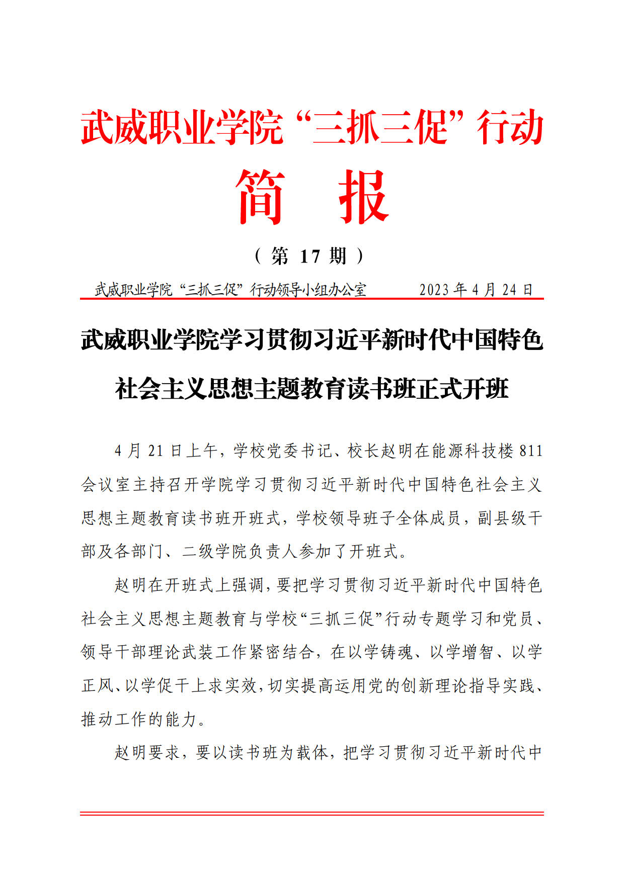 簡報第17期:學(xué)習(xí)貫徹習(xí)近平新時代中國特色社會主義 思想主題教育讀書班正式開班