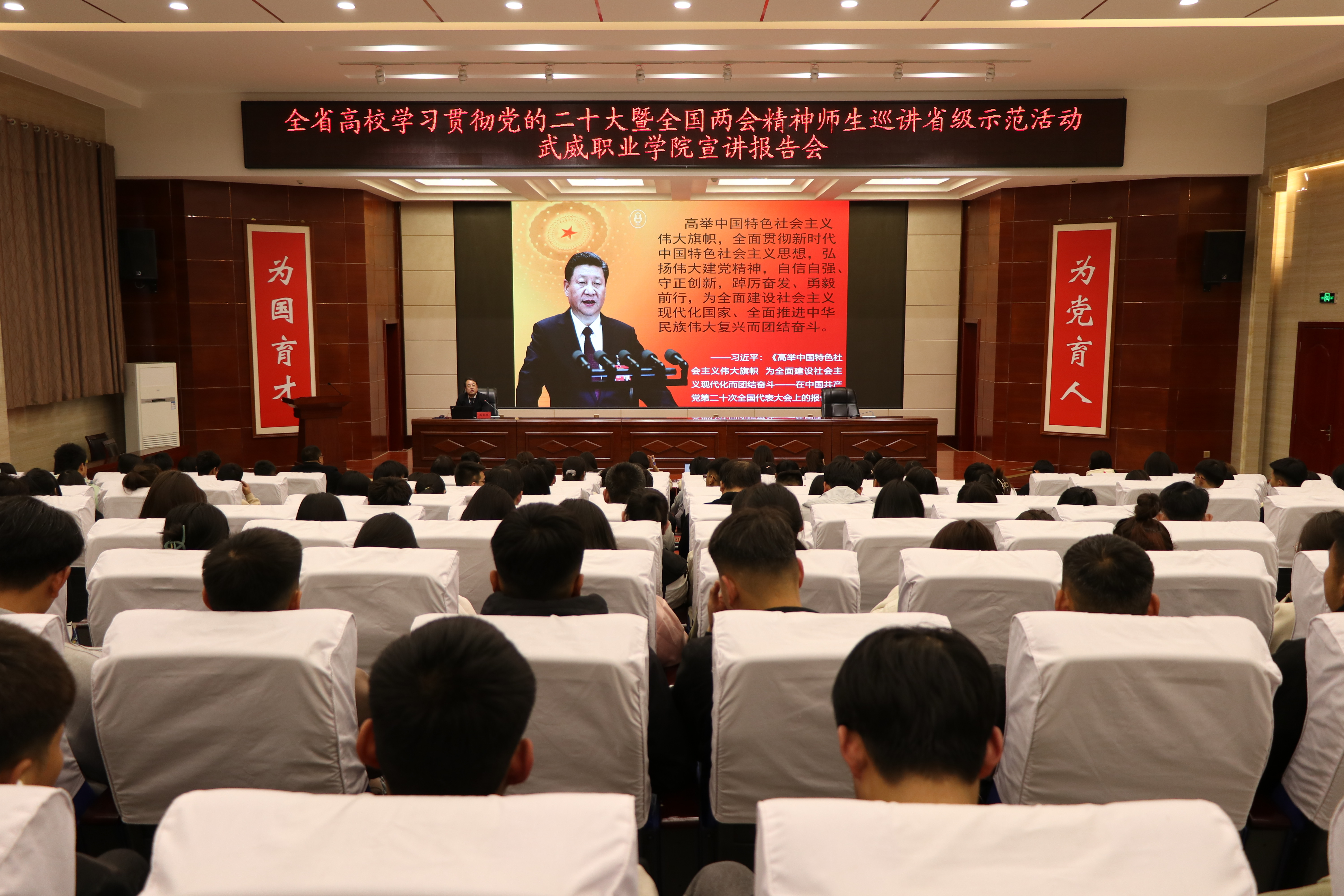 4月23日下午,省委教育工委“逐夢(mèng)新征程 奮斗創(chuàng)未來”全省高校學(xué)習(xí)貫徹黨的二十大暨全國兩會(huì)精神師生巡講省級(jí)示范活動(dòng),第五巡講團(tuán)來我校開展宣講。第五巡講團(tuán)組長、蘭州交通大學(xué)馬克思主義學(xué)院蘇星鴻教授,作了專題報(bào)告。學(xué)校宣傳統(tǒng)戰(zhàn)部全體成員、馬克思主義學(xué)院全體教師、各二級(jí)學(xué)院學(xué)生代表共計(jì)200余人聆聽了巡講報(bào)告。