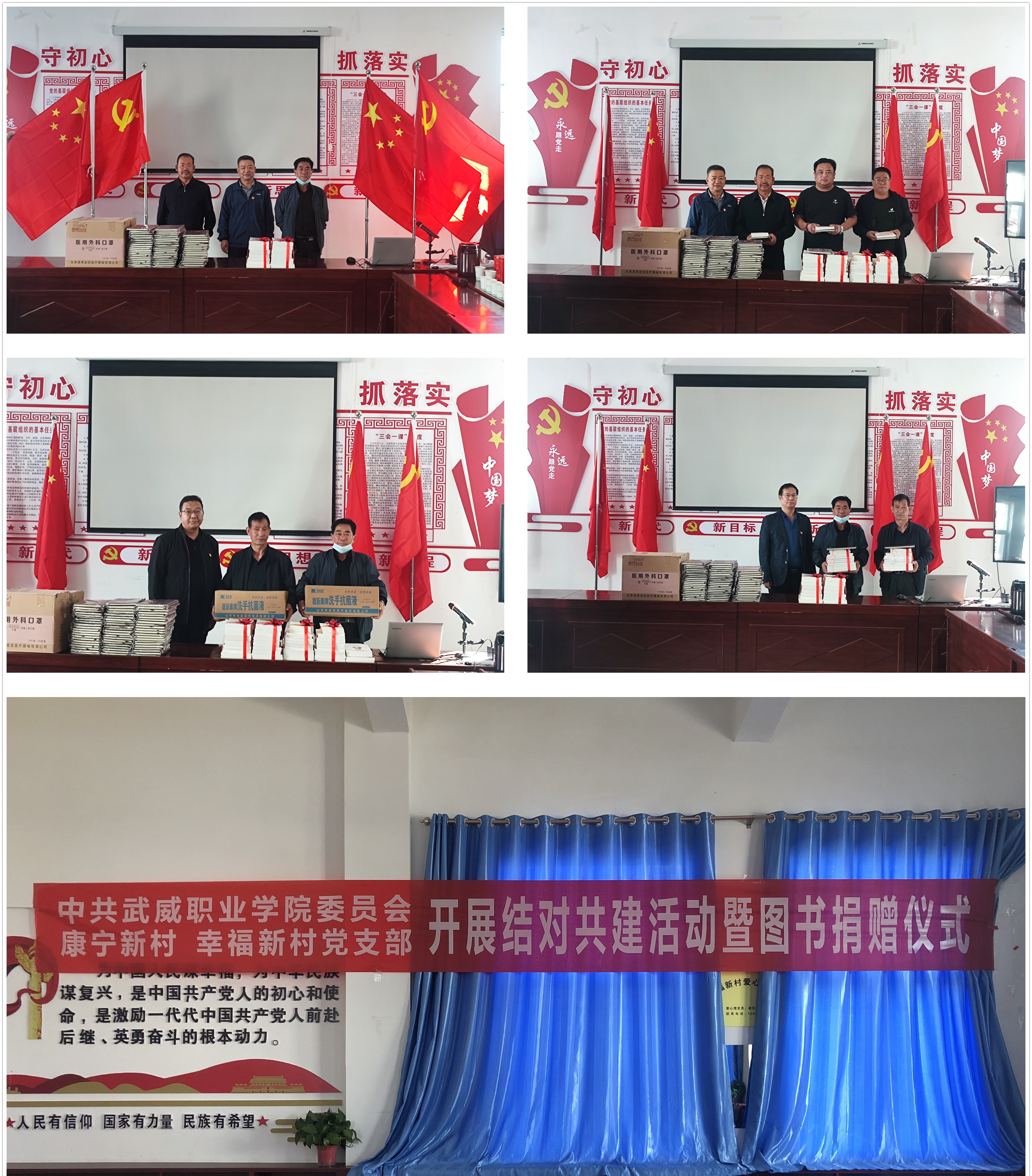 趙明代表學校黨委向幫扶村每個黨支部贈送了黨旗和國旗、《毛澤東選集》第一至四卷、《鄧小平文集》第一至三卷、《江澤民文選》第一至三卷、《胡錦濤文選》第一至三卷、《習近平談治國理政》第一至四卷、《習近平書信選集》《中國共產(chǎn)黨百年歷史經(jīng)驗》等書籍。陳曉煜向幫扶村黨支部贈送了防疫物資,張開禮向幫扶村在家黨員贈送了黨員學習筆記本。