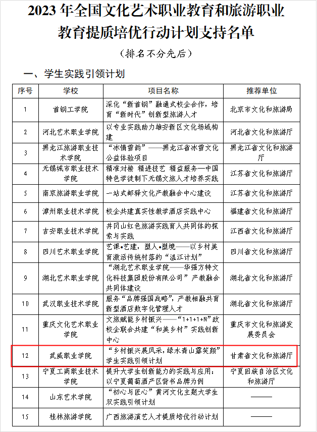 6月8日,文化和旅游部公布2023年全國文化藝術(shù)職業(yè)教育和旅游職業(yè)教育提質(zhì)培優(yōu)行動計劃入選名單,我校申報的學(xué)生實踐引領(lǐng)計劃項目成功入選,是甘肅省唯一入選項目,全國僅15家單位入選。