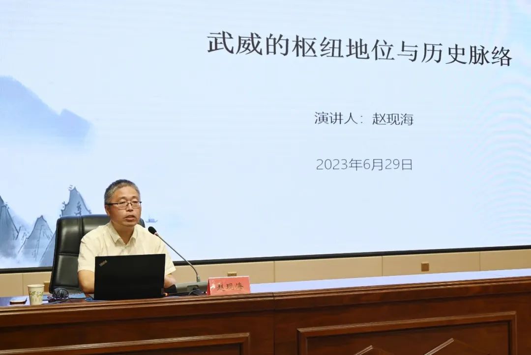 6月29日,2023年第二期《涼州講壇》在武威市開講,中國社會科學(xué)院古代史研究所古代通史研究室主任、研究員趙現(xiàn)海應(yīng)邀在武威職業(yè)學(xué)院作《武威的樞紐地位與歷史脈絡(luò)》的專題講座。市委宣傳部常務(wù)副部長林艷軍主持。