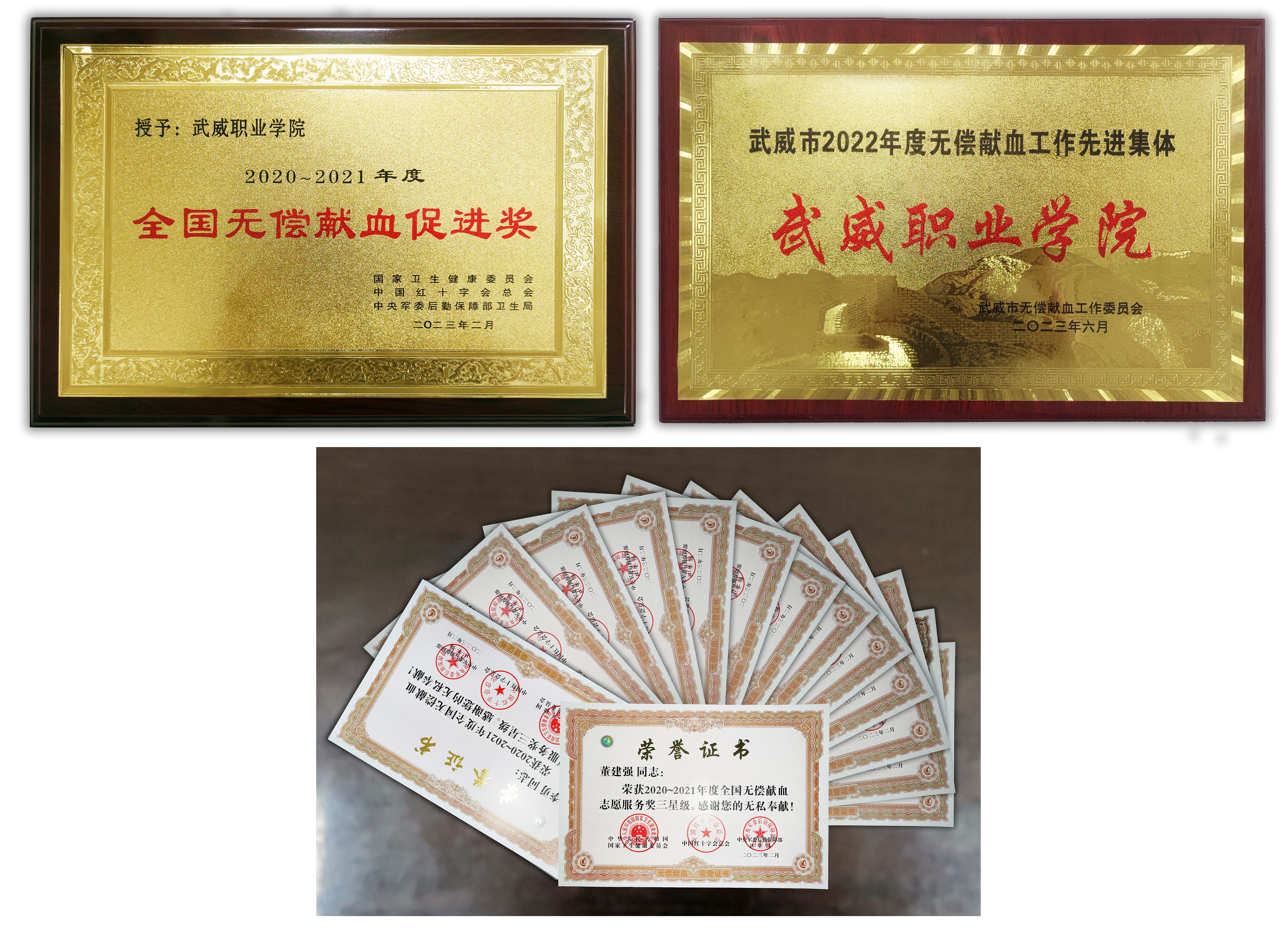 學校繼2020年獲得“2018-2019年度全國無償獻血促進獎”后,再次榮獲“2020-2021年度全國無償獻血促進獎”,14名師生榮獲全國無償獻血志愿服務獎。我校護理學院被評為武威市2022年度無償獻血工作先進集體,1名教師被評為先進個人。
