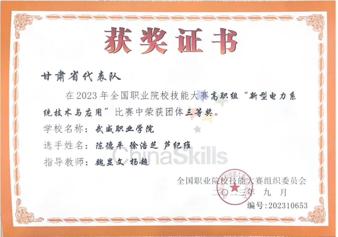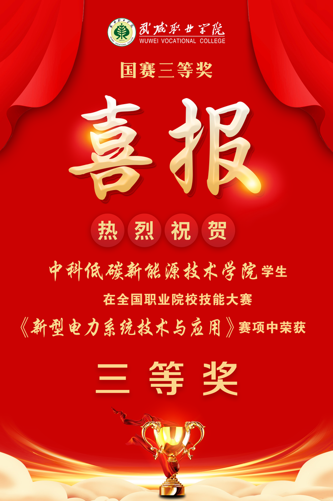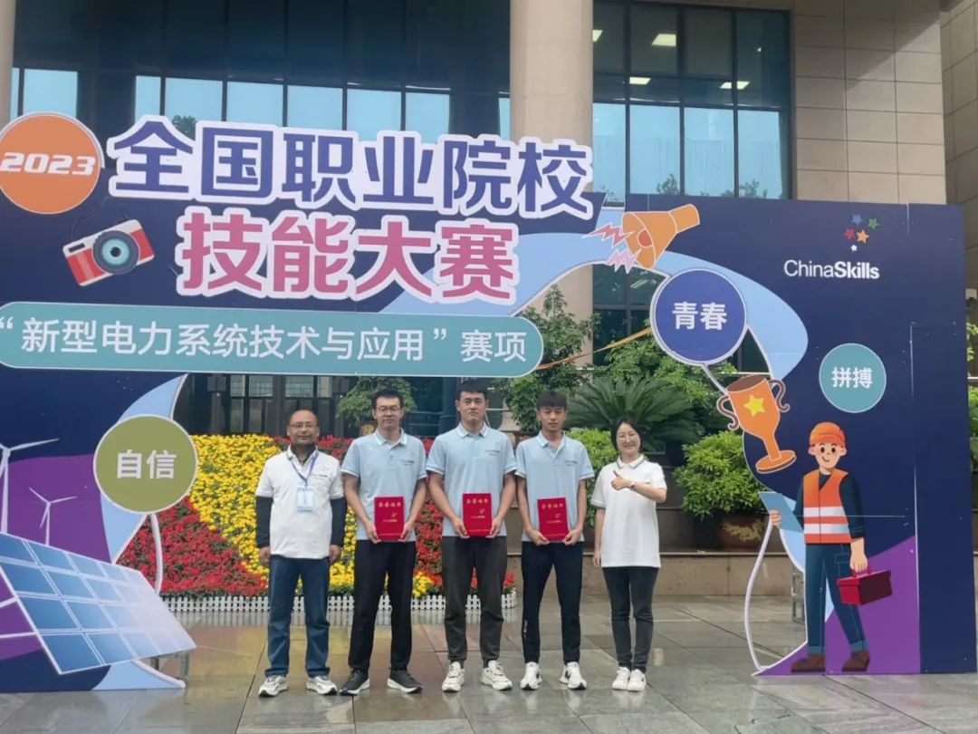 在2023年全國職業(yè)院校技能大賽中中科低碳新能源技術(shù)學院學生陳德平、徐浩芝、蘆紀維獲得高職組新型電力系統(tǒng)技術(shù)與應(yīng)用賽項團體三等獎。