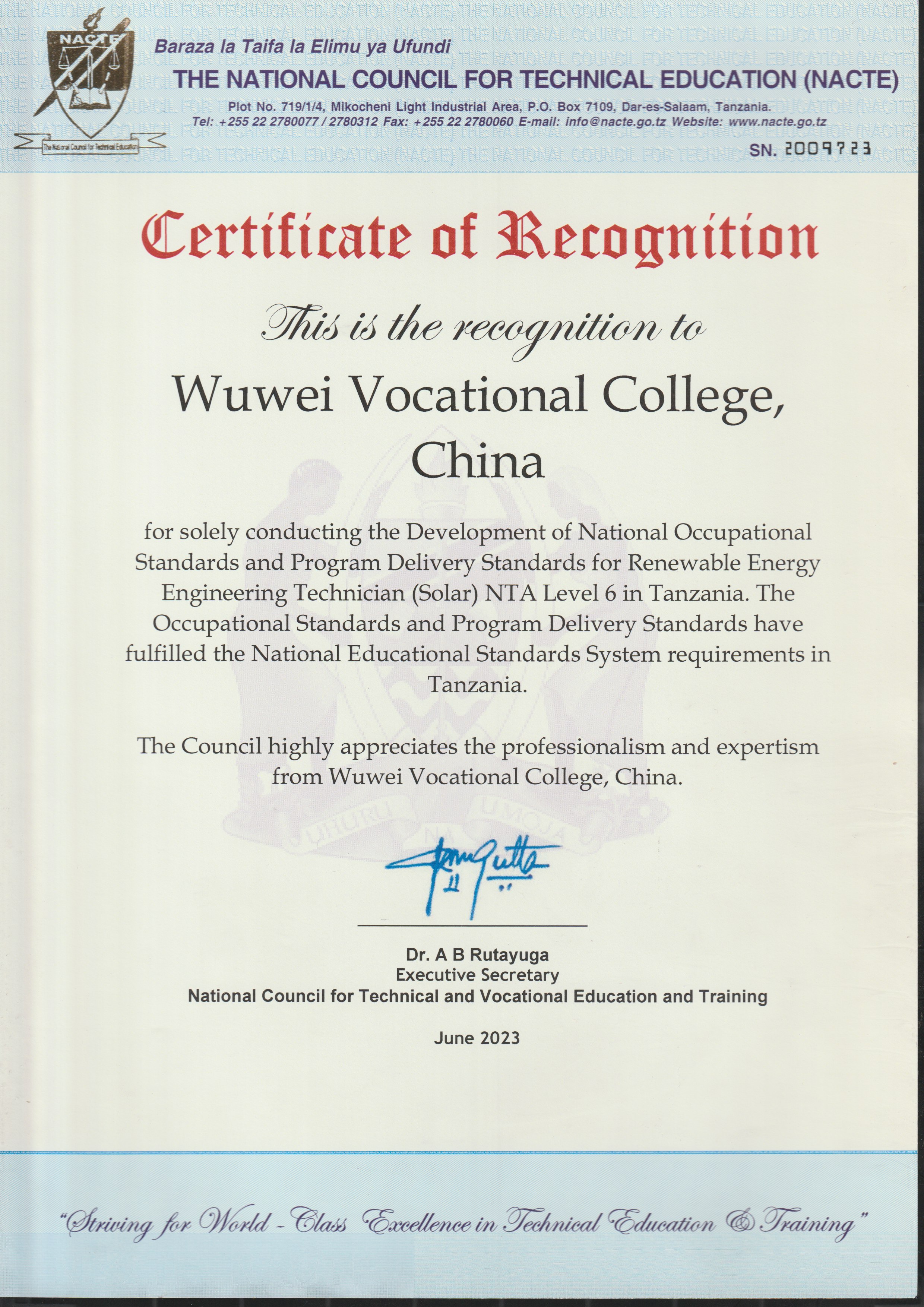 新能源工程技術員(太陽能)6級職業(yè)標準和配套專業(yè)教學標準通過坦桑尼亞國家職業(yè)教育委員會審核獲得認證