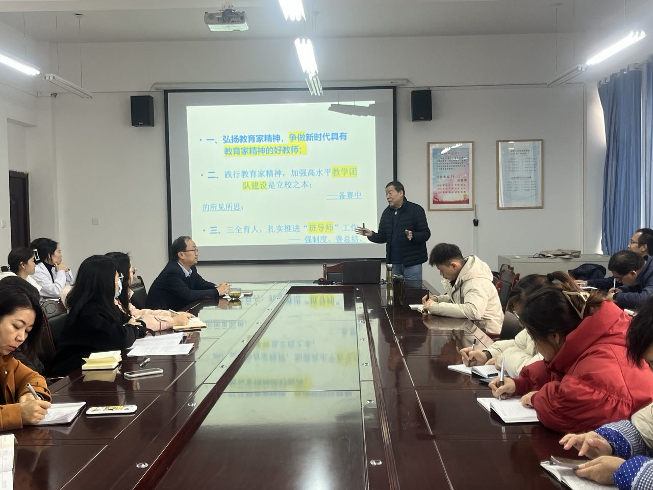 楊存忠教授主要從“弘揚(yáng)教育家精神,爭(zhēng)做新時(shí)代具有教育家精神的好老師”、“踐行教育家精神,加強(qiáng)高水平教學(xué)團(tuán)隊(duì)建設(shè)”、“三全育人,扎實(shí)推進(jìn)班導(dǎo)師工作”以及“如何上好一堂課”四部分展開。楊存忠教授解讀了中國特有教育家精神的內(nèi)涵;闡述了堅(jiān)持師德師風(fēng)第一標(biāo)準(zhǔn),大力弘揚(yáng)教育家精神的重要意義和基本要求;結(jié)合典型案例,以案為戒,勉勵(lì)新時(shí)代教師既精通專業(yè)知識(shí)、做好“經(jīng)師”,又涵養(yǎng)德行、成為“人師”,努力做精于傳道授業(yè)解惑的“經(jīng)師”和“人師”的統(tǒng)一者。楊存忠教授還就如何上好一堂課與老師們進(jìn)行了深入交流。