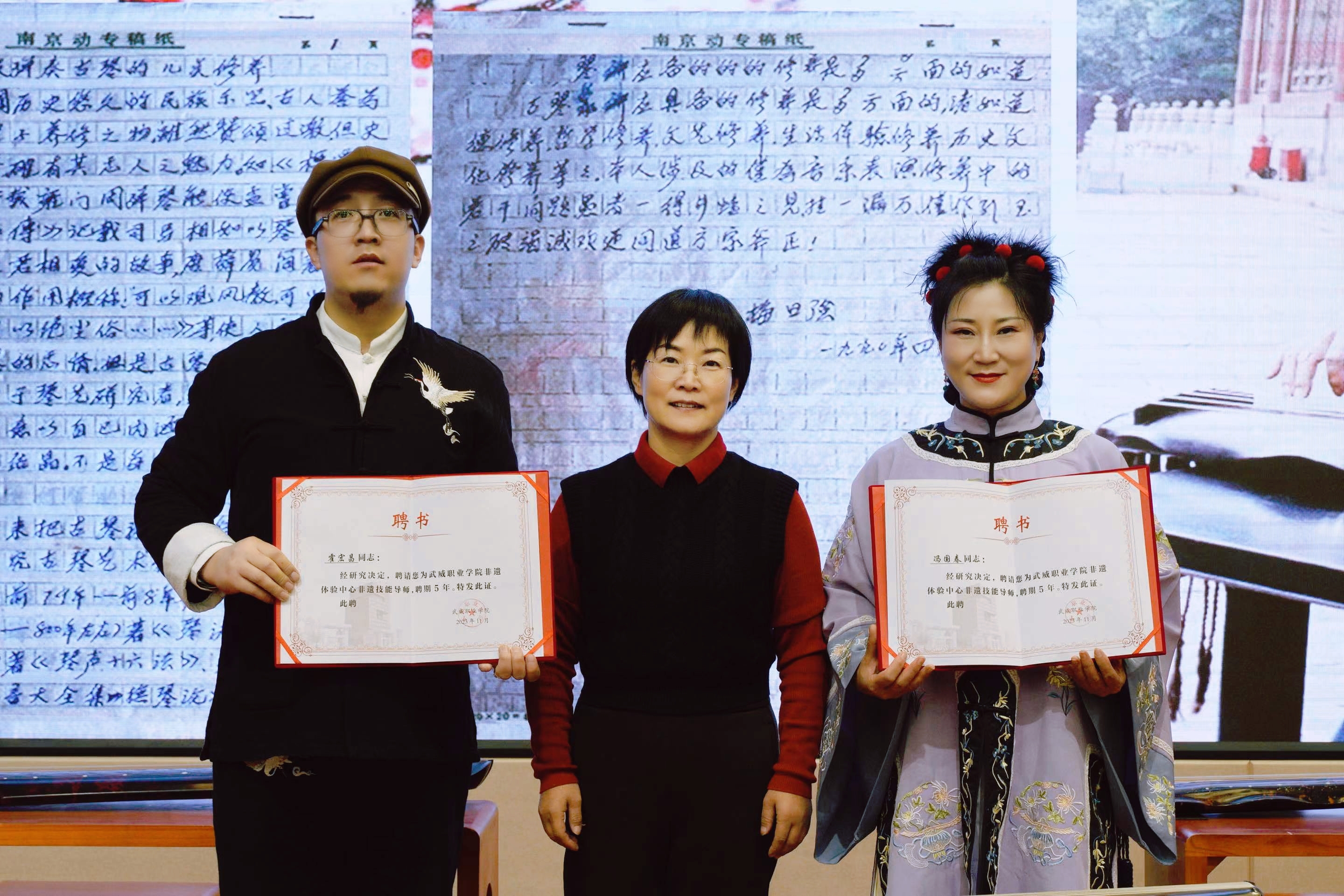 學(xué)院黨委委員、副校長(zhǎng)何毅為霍宏昌老師和馮國(guó)春老師頒發(fā)學(xué)校非遺導(dǎo)師聘書(shū),霍宏昌老師向?qū)W院傳統(tǒng)文化體驗(yàn)中心、非遺體驗(yàn)中心贈(zèng)送古琴。中國(guó)古琴音樂(lè)是一門(mén)具有深厚歷史文化背景的藝術(shù),它以多重美的高雅品質(zhì),引人無(wú)限向往和追求。通過(guò)此次活動(dòng),旨在吸引更多的師生關(guān)注和傳承好中華優(yōu)秀傳統(tǒng)文化。