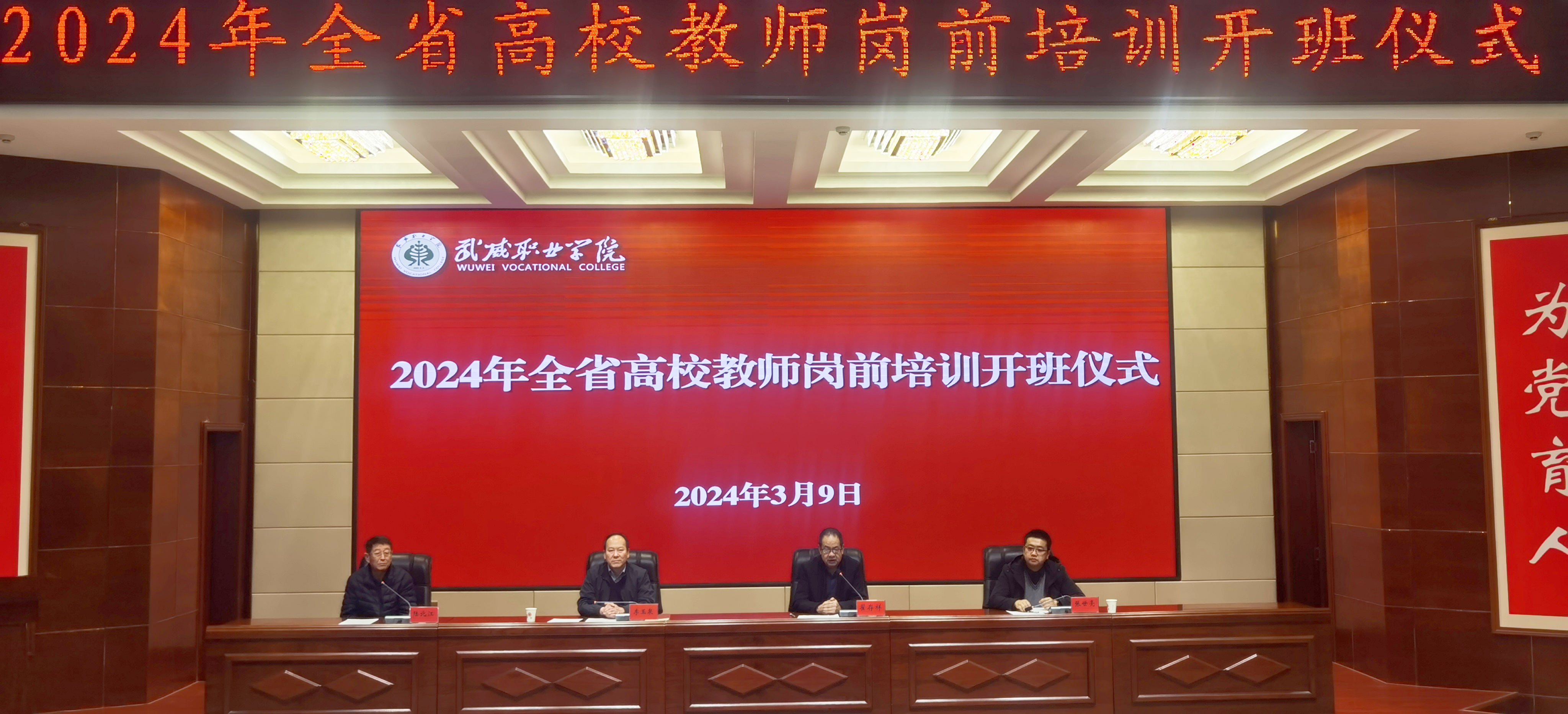 為引導(dǎo)廣大教師深刻領(lǐng)會(huì)教育家精神,牢記“為黨育人、為國育才”初心使命,樹立躬耕教壇信念,培養(yǎng)高素質(zhì)教師隊(duì)伍,3月9日上午,我校2024年上半年兼職教師崗前培訓(xùn)教學(xué)班開班儀式暨第一階段集中培訓(xùn)在學(xué)生發(fā)展中心菁英廳舉行。西北師范大學(xué)繼續(xù)教育學(xué)院副院長李玉泉、武威職業(yè)學(xué)院黨委副書記翟存祥、教務(wù)處負(fù)責(zé)人張世亮出席會(huì)議并講話,142名兼職教師參加開班儀式。儀式由甘肅省高等學(xué)校師資培訓(xùn)中心副主任陸北江主持。開班儀式上,張世亮介紹了本次兼職教師崗前培訓(xùn)基本情況,對培訓(xùn)工作作了部署安排。