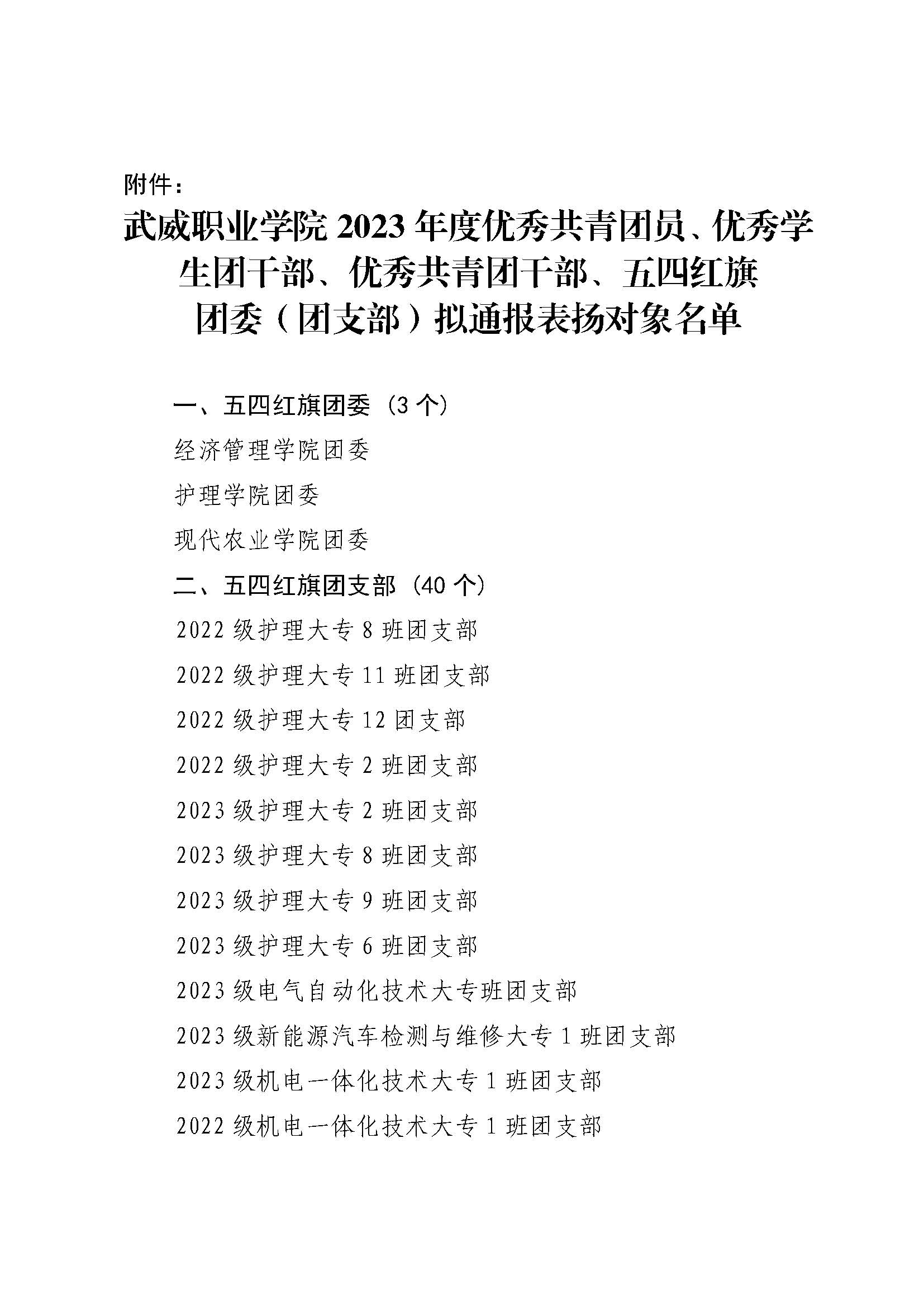 關(guān)于武威職業(yè)學(xué)院2023年度優(yōu)秀共青團(tuán)員、優(yōu)秀學(xué)生團(tuán)干部、優(yōu)秀共青團(tuán)干部、五四紅旗團(tuán)委(團(tuán)支部)擬通報(bào)表揚(yáng)對象的公示