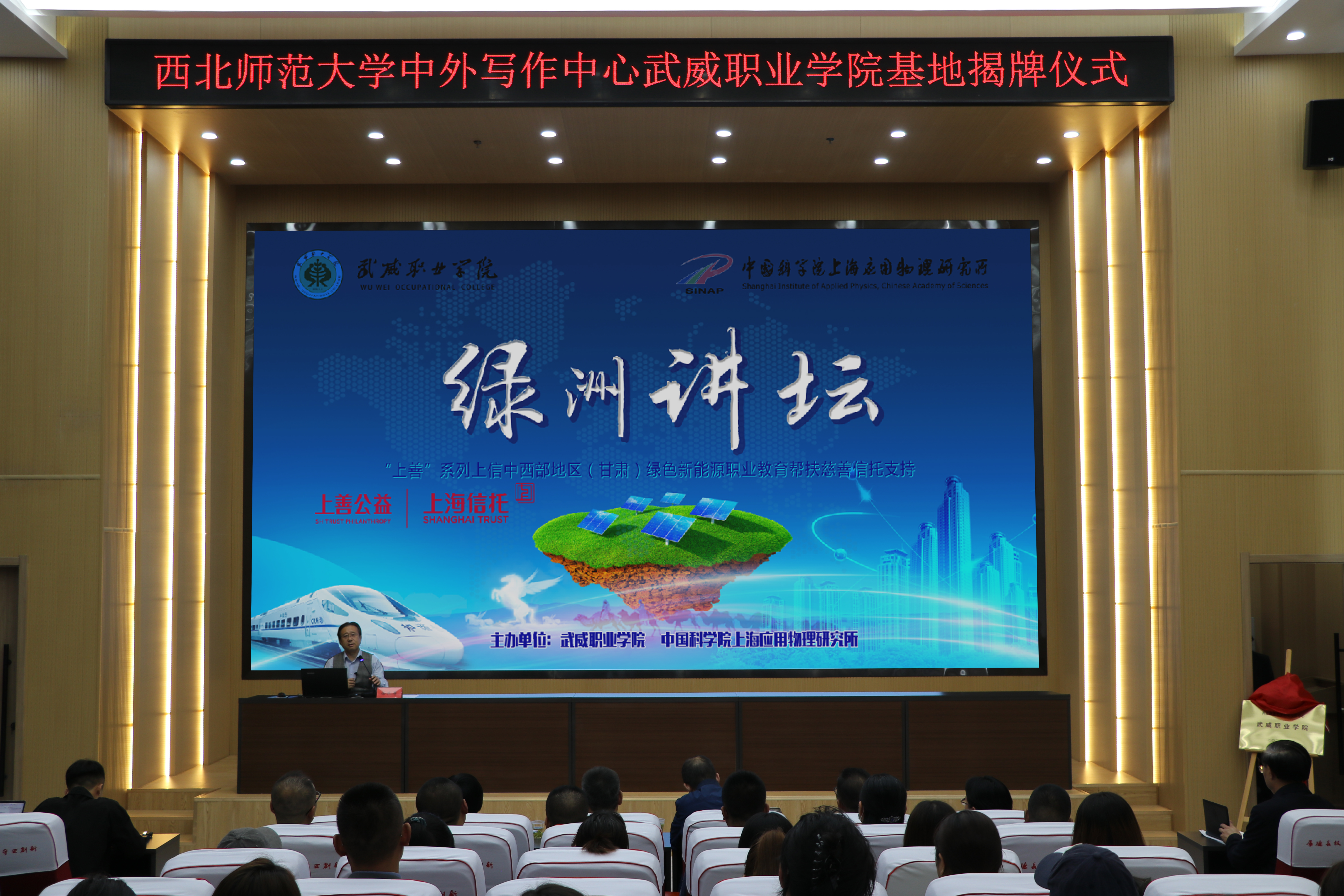 西北師范大學中外寫作中心常務副主任徐兆壽教授,中國日報社甘肅記者站馬靜娜站長,涼州文化研究院院長張國才、武威職業(yè)學院所有校領導、中層干部及師生代表參加揭牌儀式及報告會。活動由武威職業(yè)學院黨委書記王宏主持,武威職業(yè)學院黨委副書記、校長張開禮代表學校致辭。