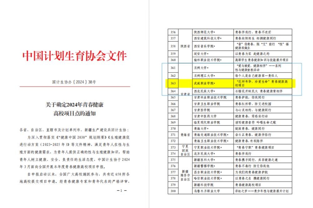 日前,中國計(jì)劃生育協(xié)會(huì)發(fā)布《關(guān)于確定2024年青春健康高校項(xiàng)目點(diǎn)的通知》,我校學(xué)生工作部、校團(tuán)委、護(hù)理學(xué)院共同申報(bào)的“花樣年華,珍愛生命”項(xiàng)目,從全國各地500余所高校中脫穎而出,自2022年以來連續(xù)三次成功中標(biāo)中國計(jì)生協(xié)專項(xiàng)資助A類項(xiàng)目,成為甘肅省中標(biāo)A類項(xiàng)目院校中唯一一所高職院校。