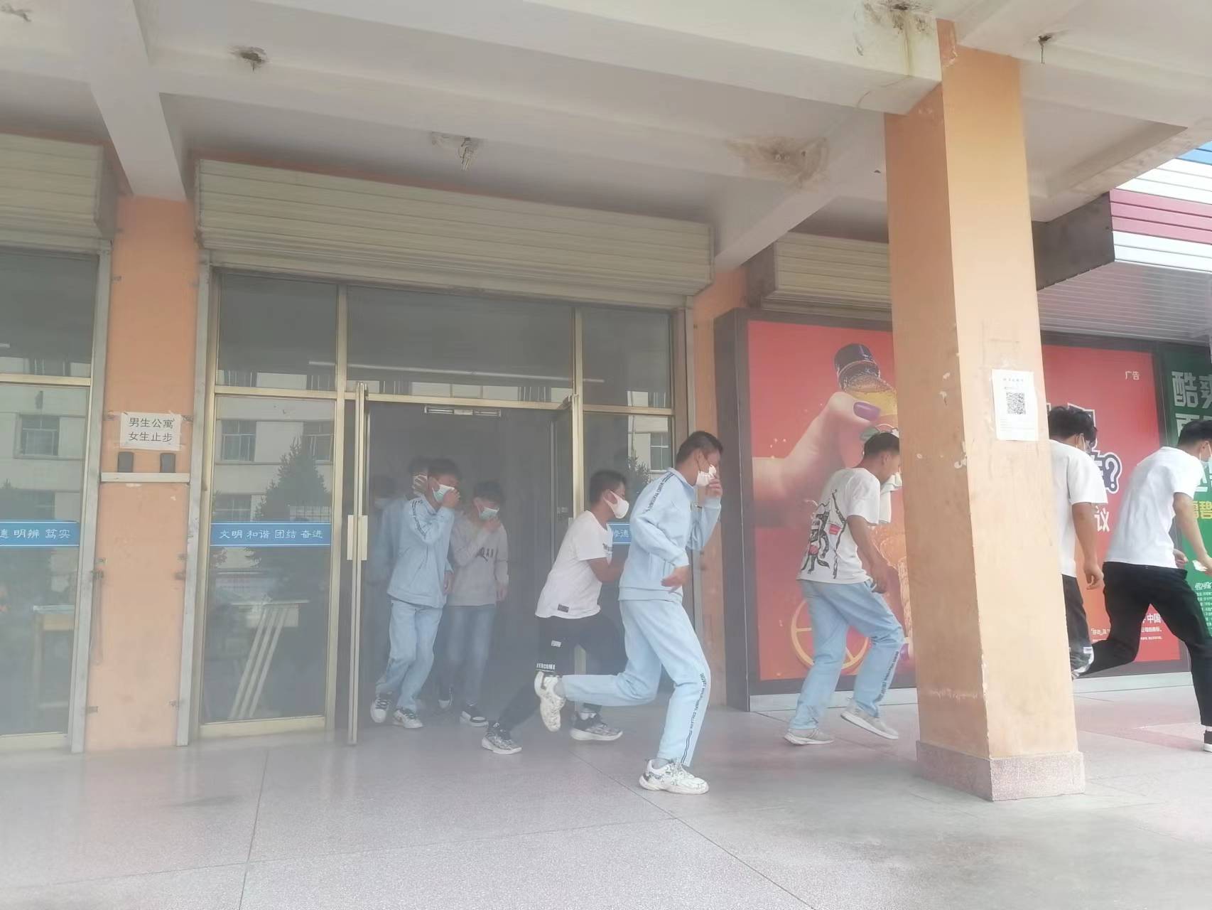 15時20分,疏散演練正式開始。隨著火災(zāi)警報(bào)響起,安全保衛(wèi)工作人員點(diǎn)燃煙餅,在學(xué)生公寓樓模擬火災(zāi)現(xiàn)場,冒出滾滾濃煙,公寓管理人員迅速組織學(xué)生有序疏散。在輔導(dǎo)員、班主任的引導(dǎo)下,同學(xué)們按照動作要領(lǐng),用濕毛巾捂住口鼻,俯身彎腰按照安全出口指示牌快速、有序從疏散通道撤離到體育場,整個過程緊張有序,實(shí)用性強(qiáng),達(dá)到了預(yù)期效果。