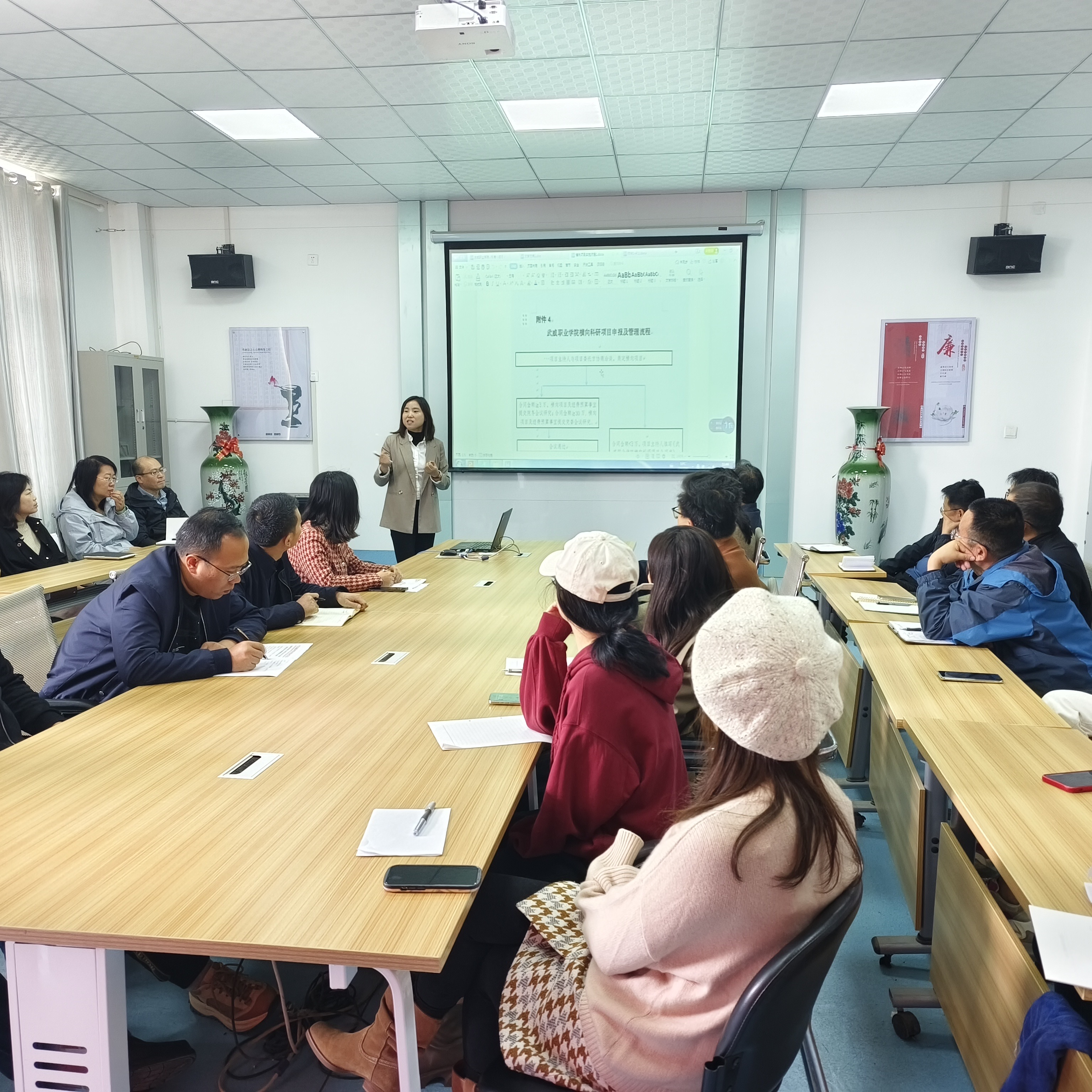 活動中,科技處工作人員宣講了橫向技術服務工作的實施流程,包括項目設置、合同簽訂、經費報銷、政策解讀等方面,尤其是對合同的填寫、任務書的填寫以及橫向技術服務流程的具體實施,進行了詳細的指導與解答。參訓教師針對相關培訓內容進行熱烈互動及詳細詢問,科技處工作人員積極解答教師們的疑點難點,為教師們提供實用的指導和建議。