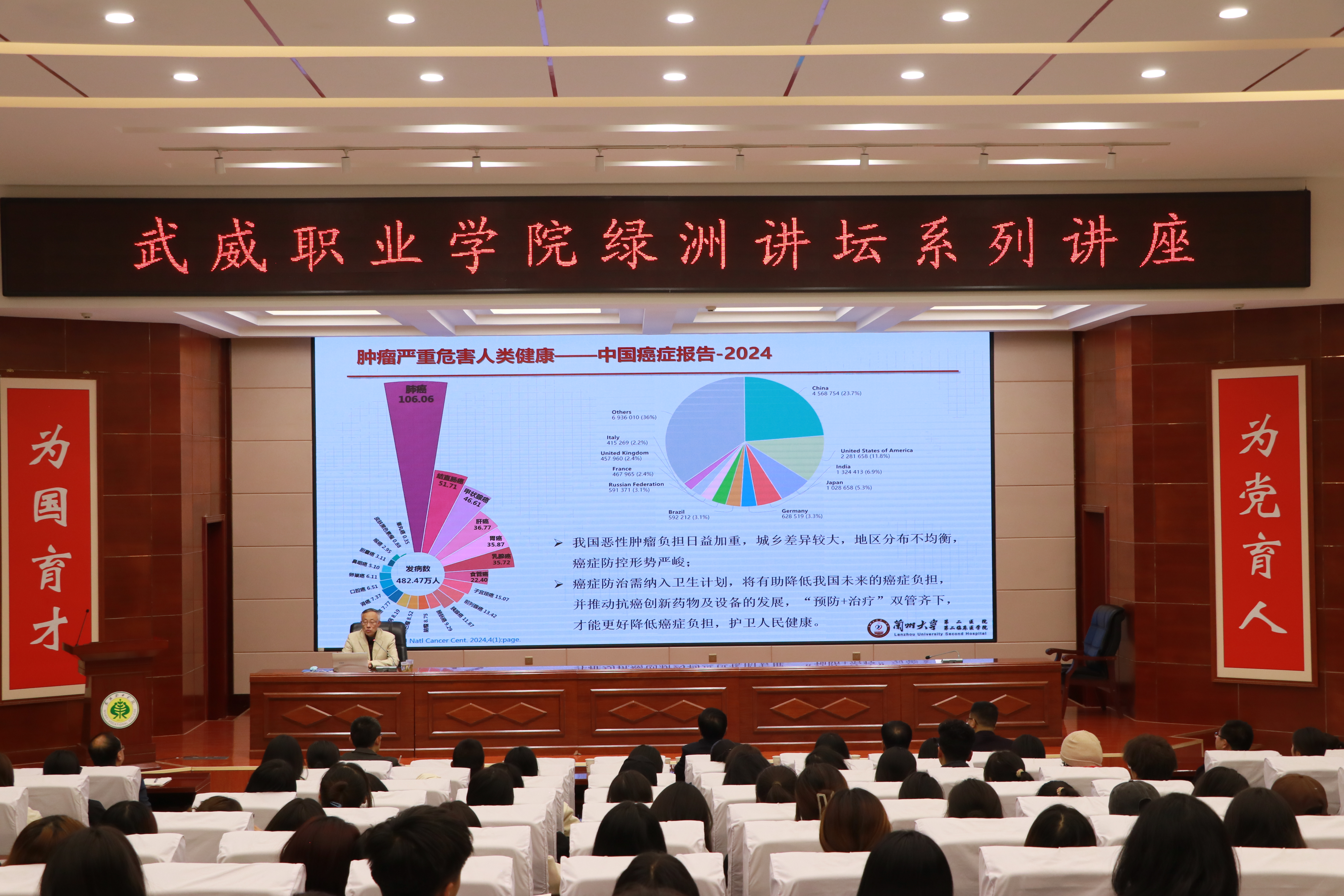 報告會由學校校長、黨委副書記張開禮主持,特邀蘭州大學第二醫(yī)院王志平教授作了“腫瘤臨床放射治療的過去、現(xiàn)在和未來與人才”的主題講座,甘肅省武威醫(yī)學科學院腫瘤醫(yī)院醫(yī)護人員代表、蘭州大學實習生代表和學校師生代表共計220余人參加了報告會。