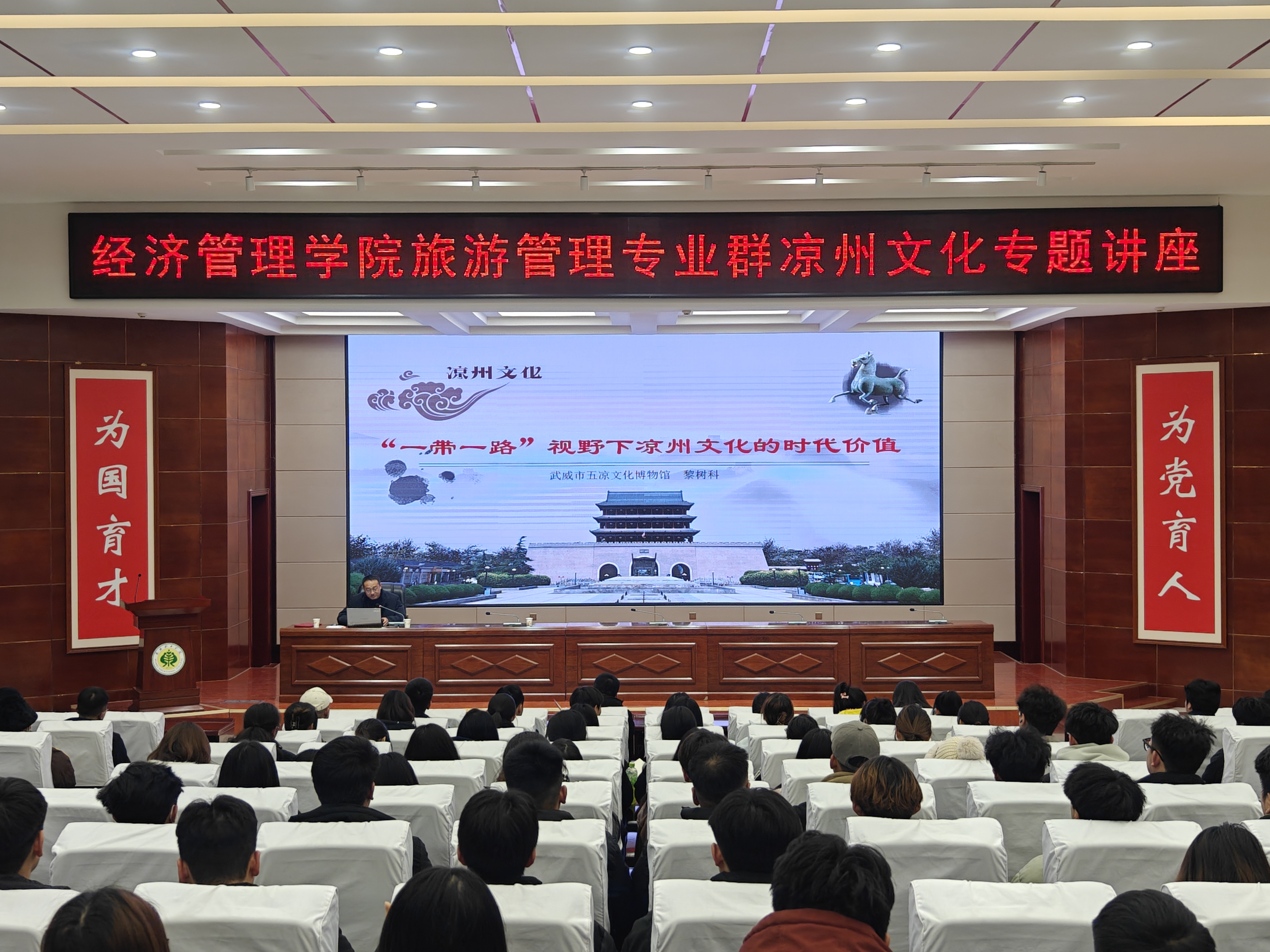 12月11日下午,經(jīng)濟(jì)管理學(xué)院邀請(qǐng)武威市五涼文化博物館館長(zhǎng)黎樹(shù)科開(kāi)展了以《“一帶一路” 視野下涼州文化的時(shí)代價(jià)值》為主題的講座,旨在深入貫徹文化傳承發(fā)展戰(zhàn)略,加強(qiáng)傳統(tǒng)文化的弘揚(yáng)與教育。學(xué)院近200名師生參加此次講座。