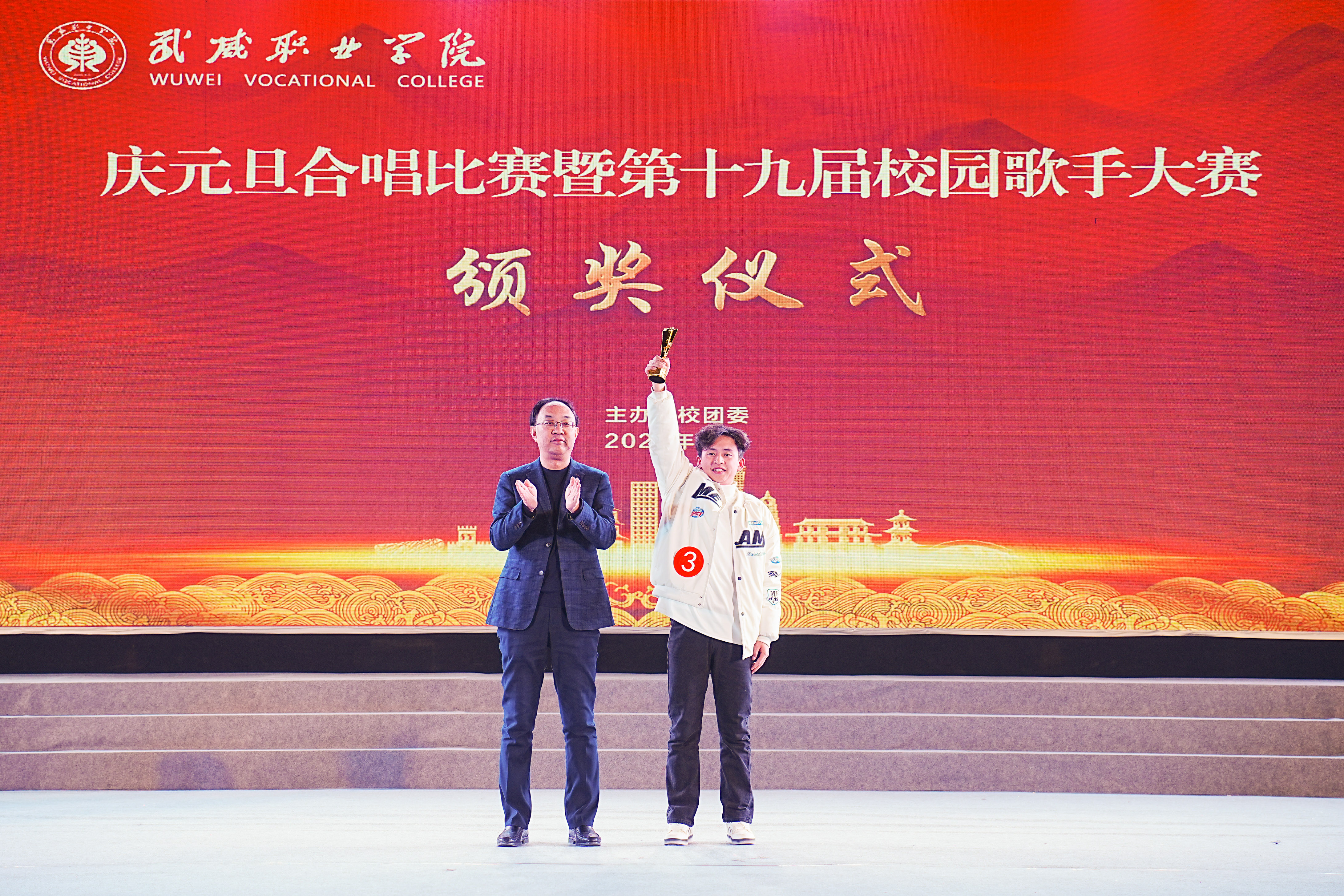 歌聲獻禮時代,青春唱響未來。12月26日晚,學(xué)?!皯c元旦”合唱比賽暨第十九屆校園歌手大賽在體育館成功舉辦。學(xué)校黨委書記王宏出席活動并為獲獎集體和個人頒獎,黨委委員、副校長王守云出席活動,各二級學(xué)院和相關(guān)部門負責(zé)人與2000余名師生現(xiàn)場觀看了比賽。