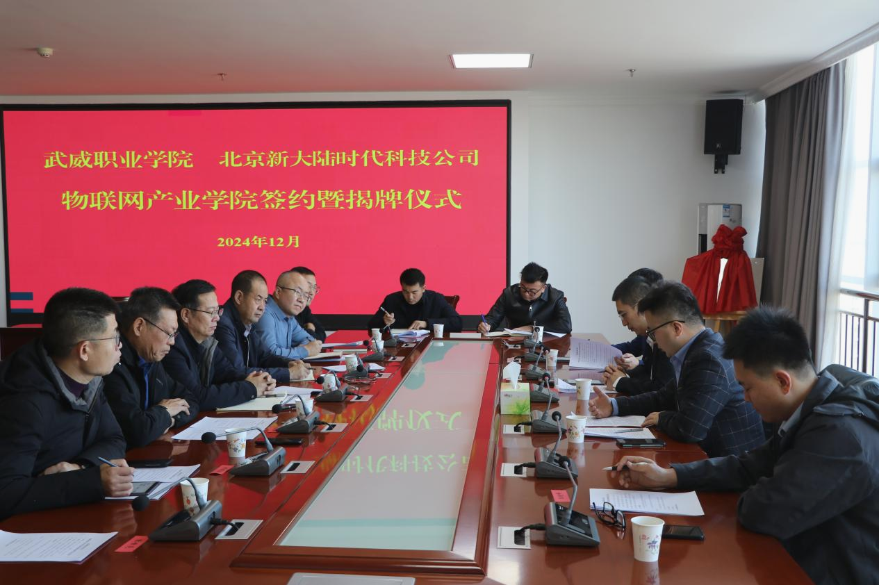 為全面深化產教融合,加強校企合作,進一步提高我校人才培養(yǎng)質量。12月3日,學校在能源科技樓811會議室舉行武威職業(yè)學院和北京新大陸時代科技公司物聯(lián)網(wǎng)產業(yè)學院簽約暨揭牌儀式。北京新大陸時代科技公司西北區(qū)總監(jiān)劉寧、技術總監(jiān)樊斌,相關業(yè)務部門負責人,學校校長、黨委副書記張開禮、黨委副書記翟存祥、相關部門負責人及教師代表參加活動。黨委委員、副校長王永緒主持儀式。