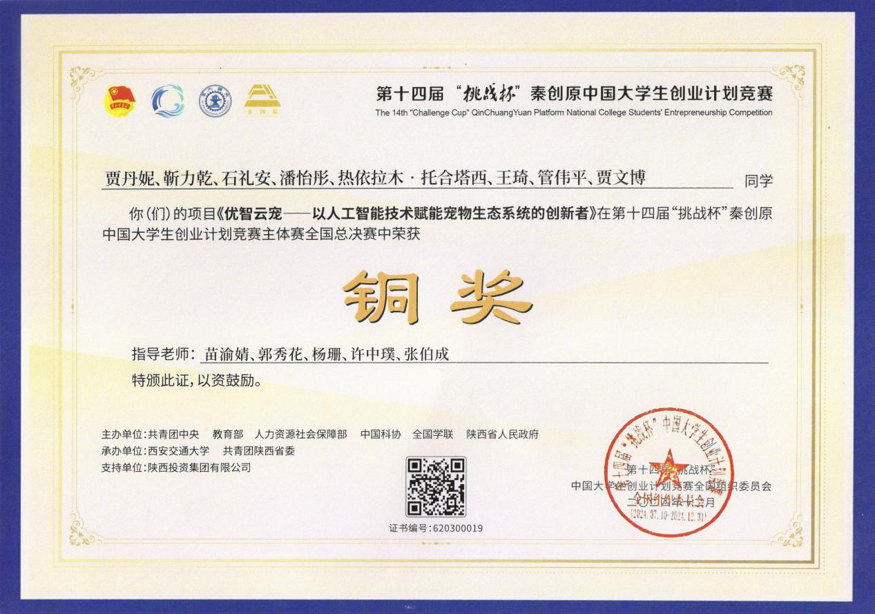 近日,由共青團(tuán)中央、教育部、人力資源和社會(huì)保障部、中國科協(xié)、全國學(xué)聯(lián)、陜西省人民政府聯(lián)合主辦的第十四屆“挑戰(zhàn)杯”秦創(chuàng)原中國大學(xué)生創(chuàng)業(yè)計(jì)劃競賽獲獎(jiǎng)名單公布。我校經(jīng)濟(jì)管理學(xué)院推送的項(xiàng)目《優(yōu)智云寵——以人工智能技術(shù)賦能寵物生態(tài)系統(tǒng)的創(chuàng)新者》首次在主體賽全國總決賽中獲獎(jiǎng),實(shí)現(xiàn)了學(xué)校這項(xiàng)賽事的歷史性突破。