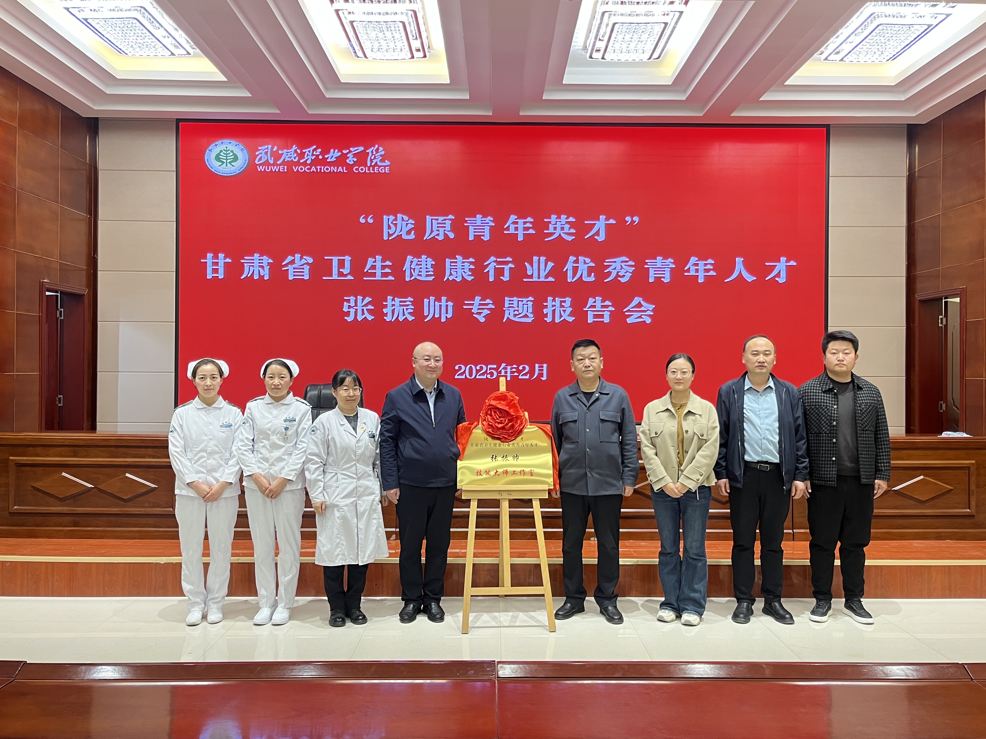 2月27日,“隴原青年英才”、甘肅省衛(wèi)生健康行業(yè)優(yōu)秀青年人才張振帥技能大師工作室揭牌儀式暨專題報(bào)告會(huì)在武威職業(yè)學(xué)院菁英廳隆重舉行。藥學(xué)院副院長(zhǎng)馬琪主持報(bào)告會(huì),200余名師生代表參會(huì),旨在傳承中醫(yī)藥文化,發(fā)揮技能大師引領(lǐng)作用,培育高素質(zhì)中醫(yī)藥技能人才。