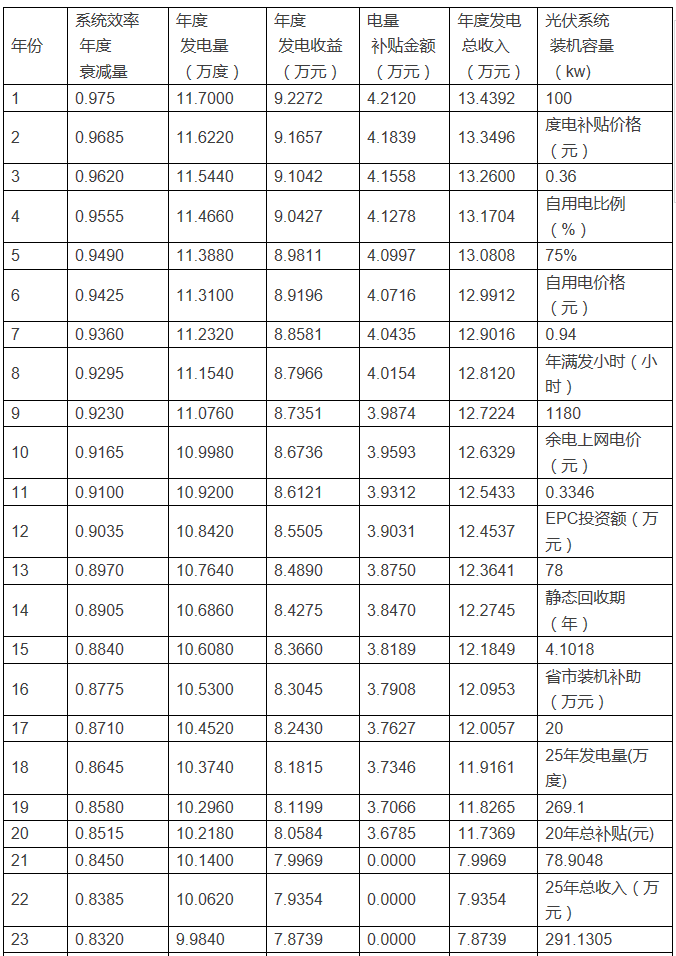 自發(fā)自用時(shí)首年/25年總收益分別為9796/204400元,回收期5.92年;全額上網(wǎng)時(shí)首年/25年總收益分別為9945/203000元,回收期5.83年。收益持平。