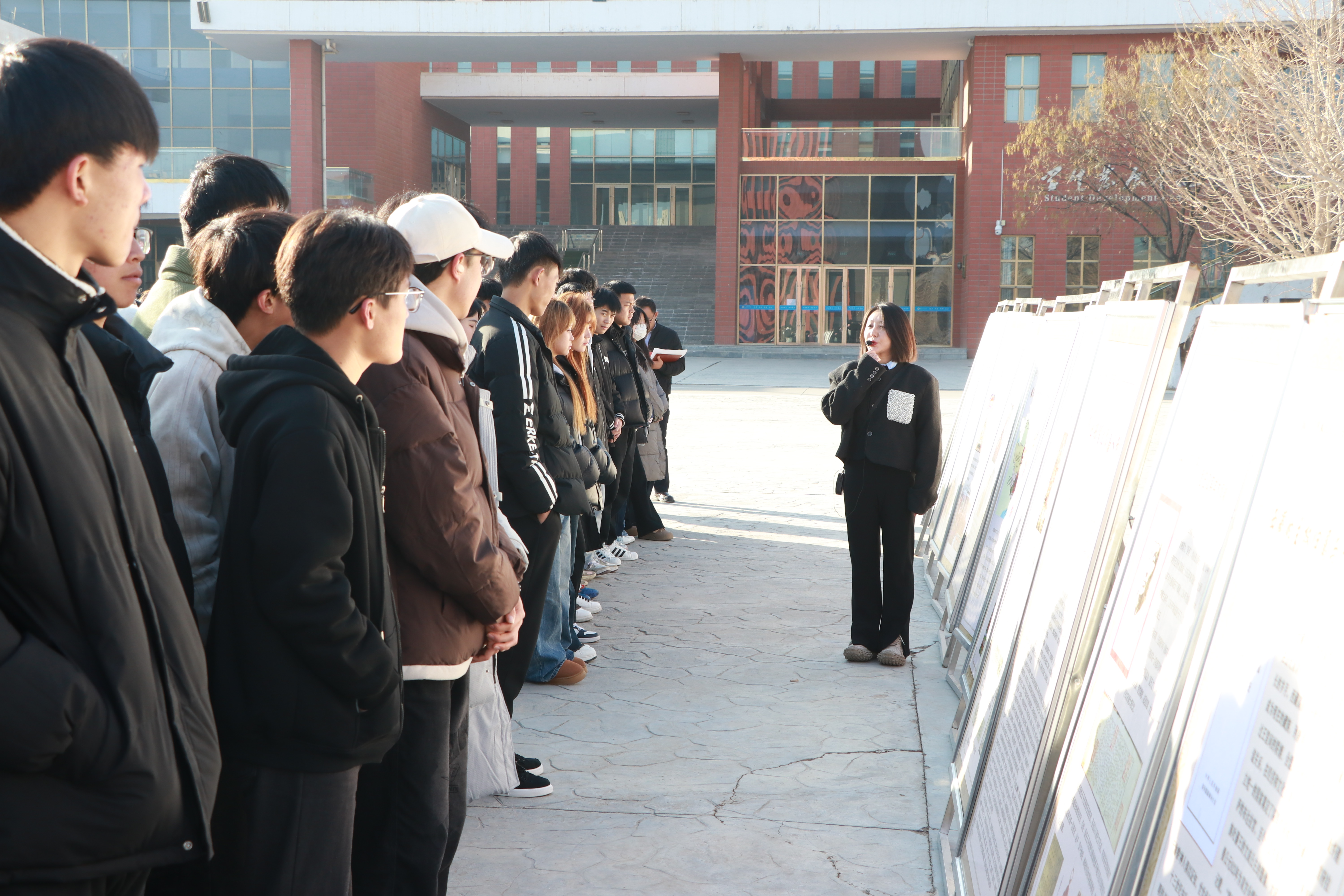 在學(xué)生發(fā)展中心前廣場,同學(xué)們現(xiàn)場參觀了民族文化宣傳展板,二十余塊展板圖文并茂生動展現(xiàn)了涼州會盟的歷史背景和意義,展示了新時代武威市在民族團(tuán)結(jié)進(jìn)步方面的壯闊歷程和取得的豐碩成果。武威市涼州會盟紀(jì)念館講解員楊琪以涼州會盟歷史為線,現(xiàn)場向大家講解了民族團(tuán)結(jié)故事。