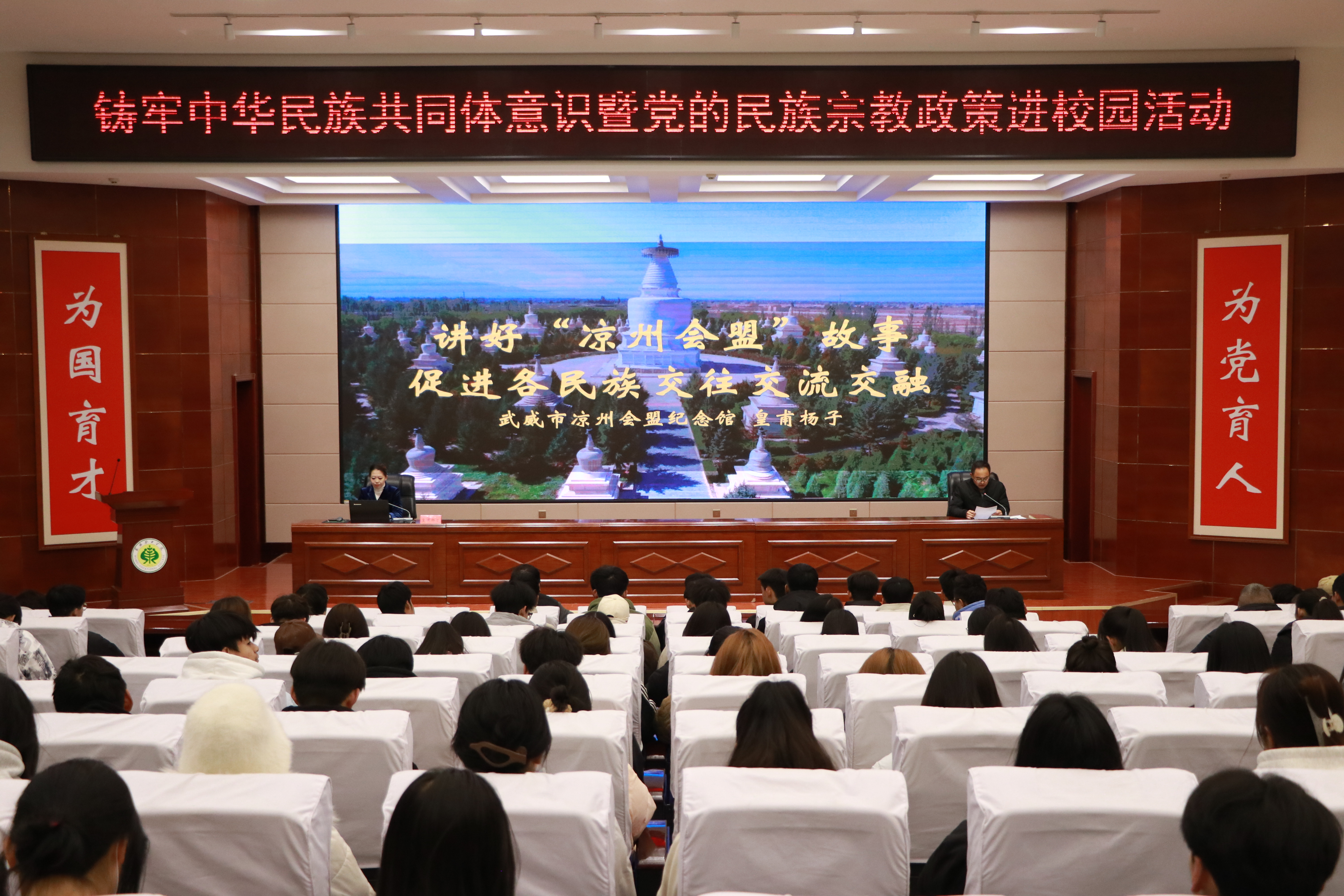 參觀活動后,武威市鑄牢中華民族共同體意識“紅石榴”宣講員皇甫楊子在學(xué)校菁英廳以《講好涼州會盟故事 促進(jìn)各民族交流交融》為題開展了主題講座。她通過生動的案例和富有感染力的語言,深入剖析涼州會盟的歷史背景、文化意義以及對當(dāng)代民族團(tuán)結(jié)的啟示,引導(dǎo)同學(xué)們深刻感知中華民族多元一體格局的優(yōu)越性,增強(qiáng)對中華民族大家庭的認(rèn)同感和歸屬感。
