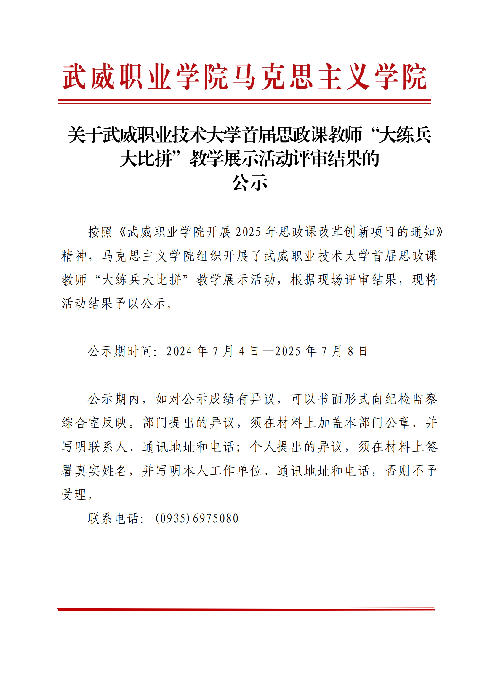 武威職業(yè)技術(shù)大學(xué)首屆思政課教師“大練兵大比拼”教學(xué)展示活動評審結(jié)果的公示