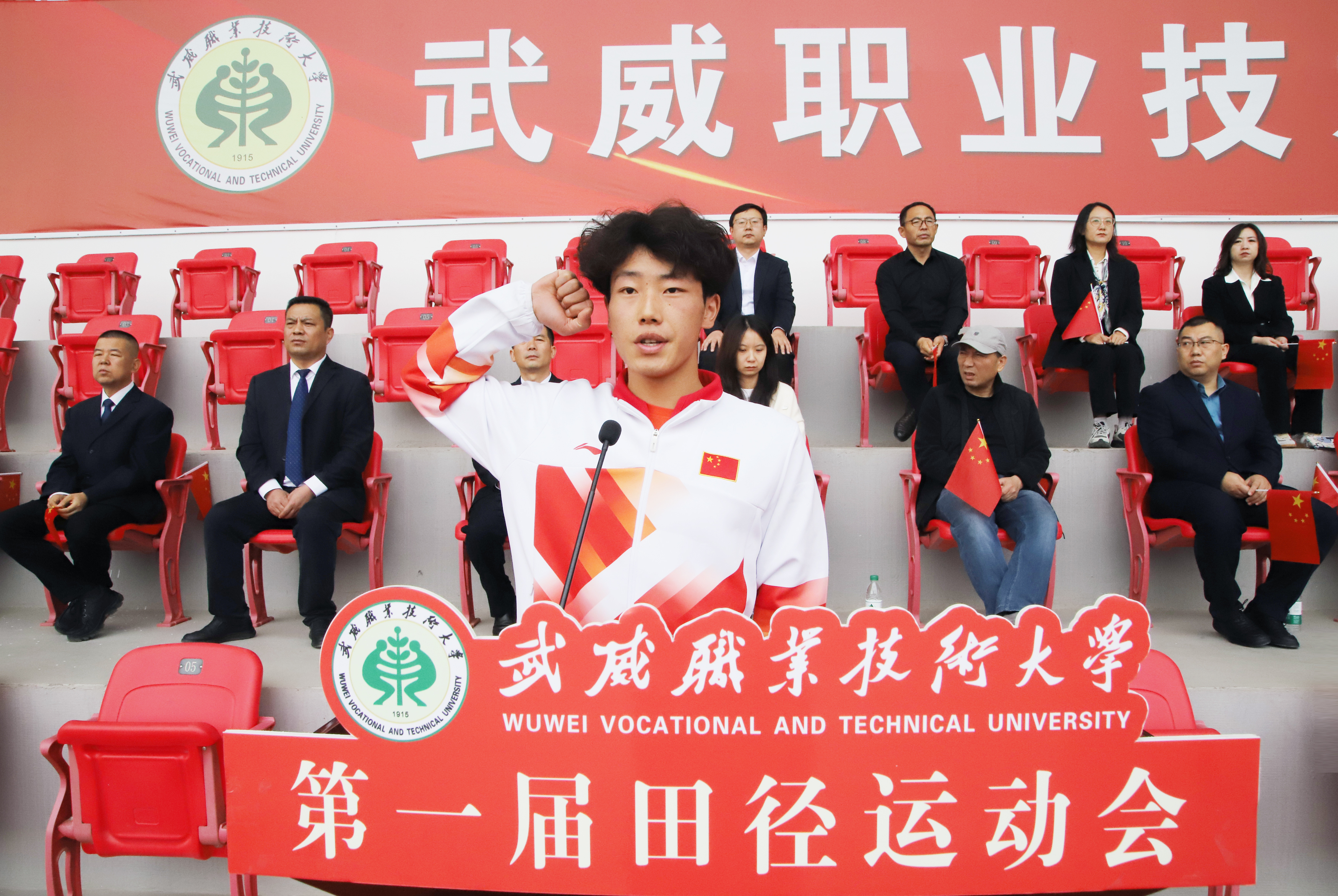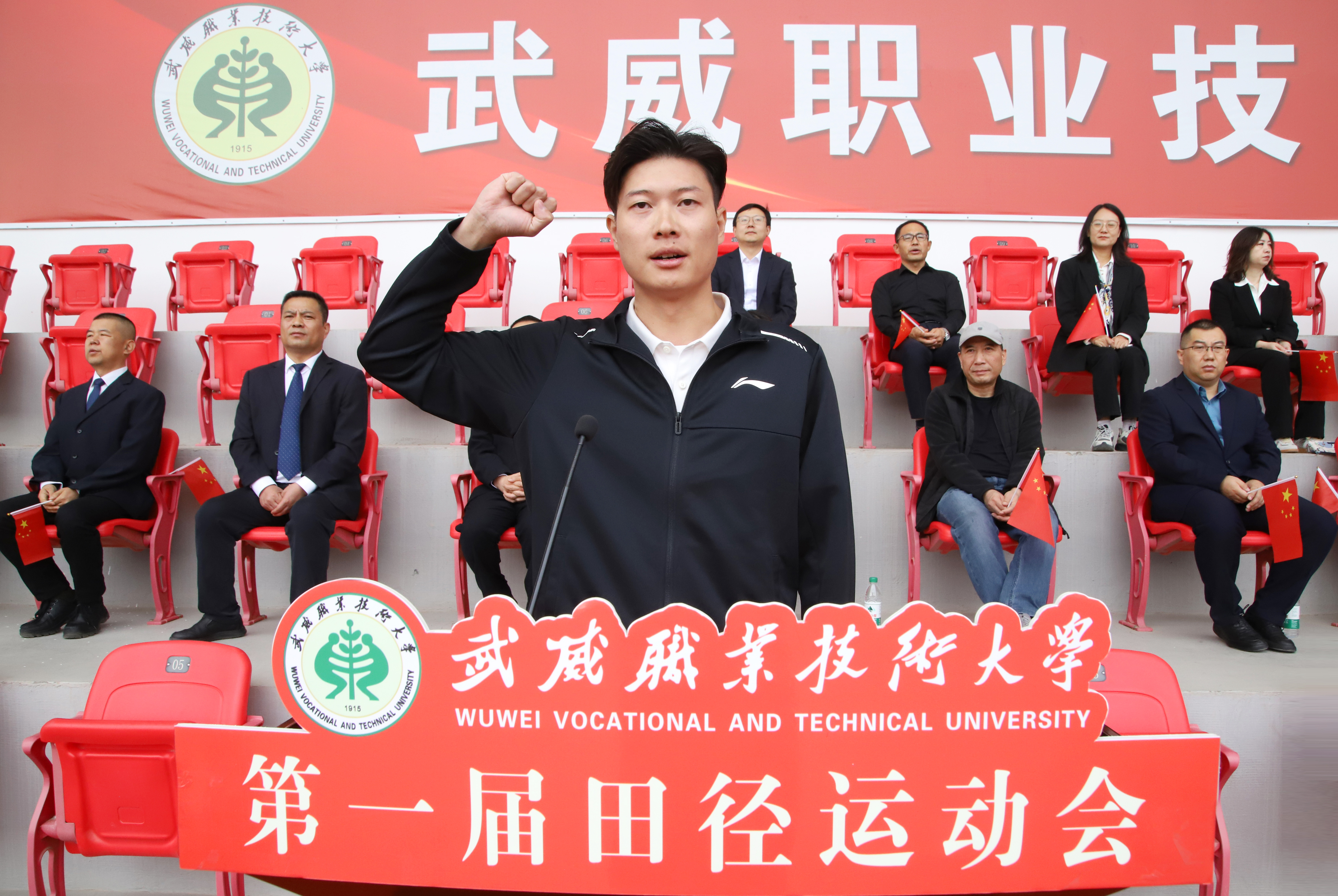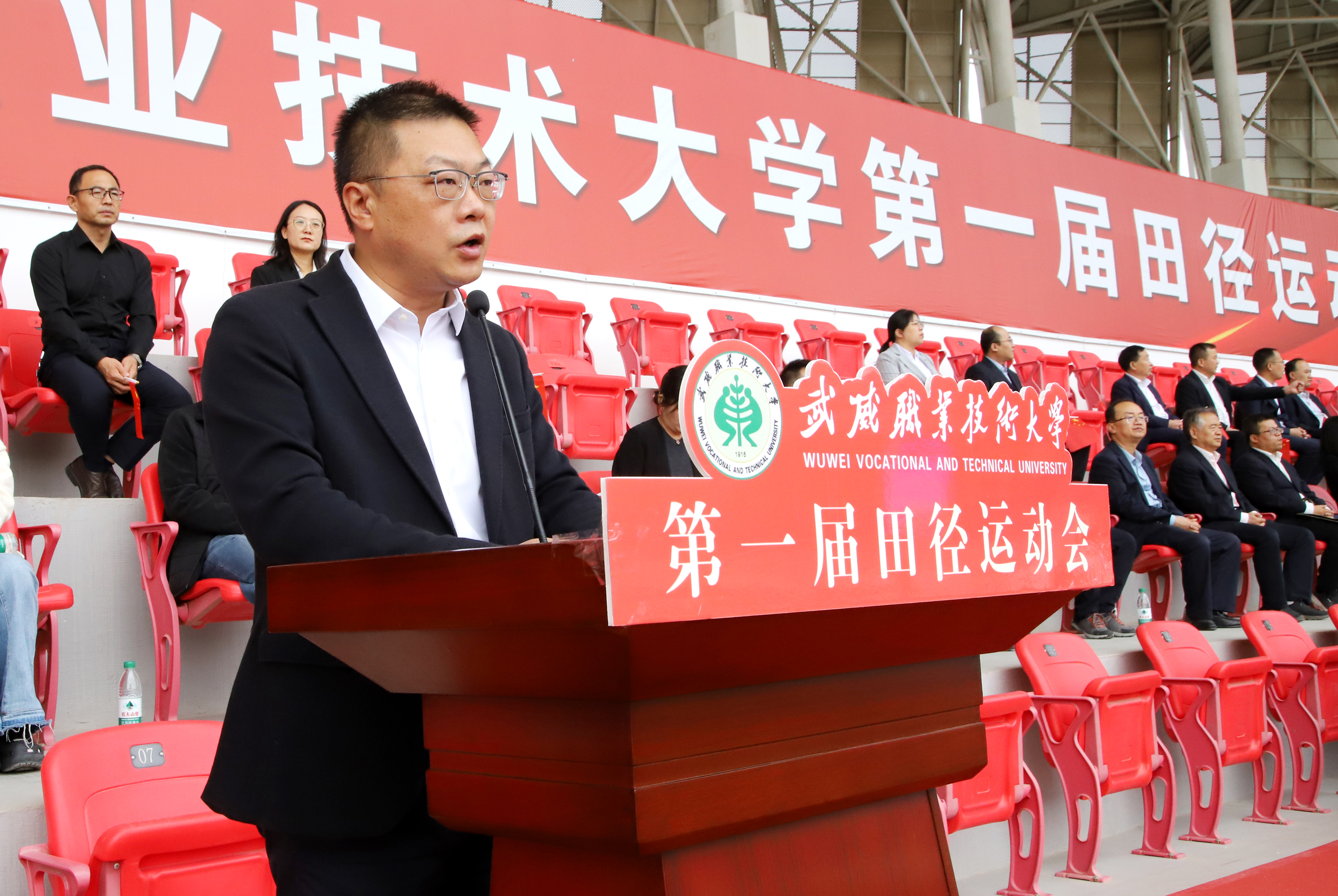 王宏宣布武威職業(yè)技術(shù)大學(xué)第一屆田徑運(yùn)動會開幕。