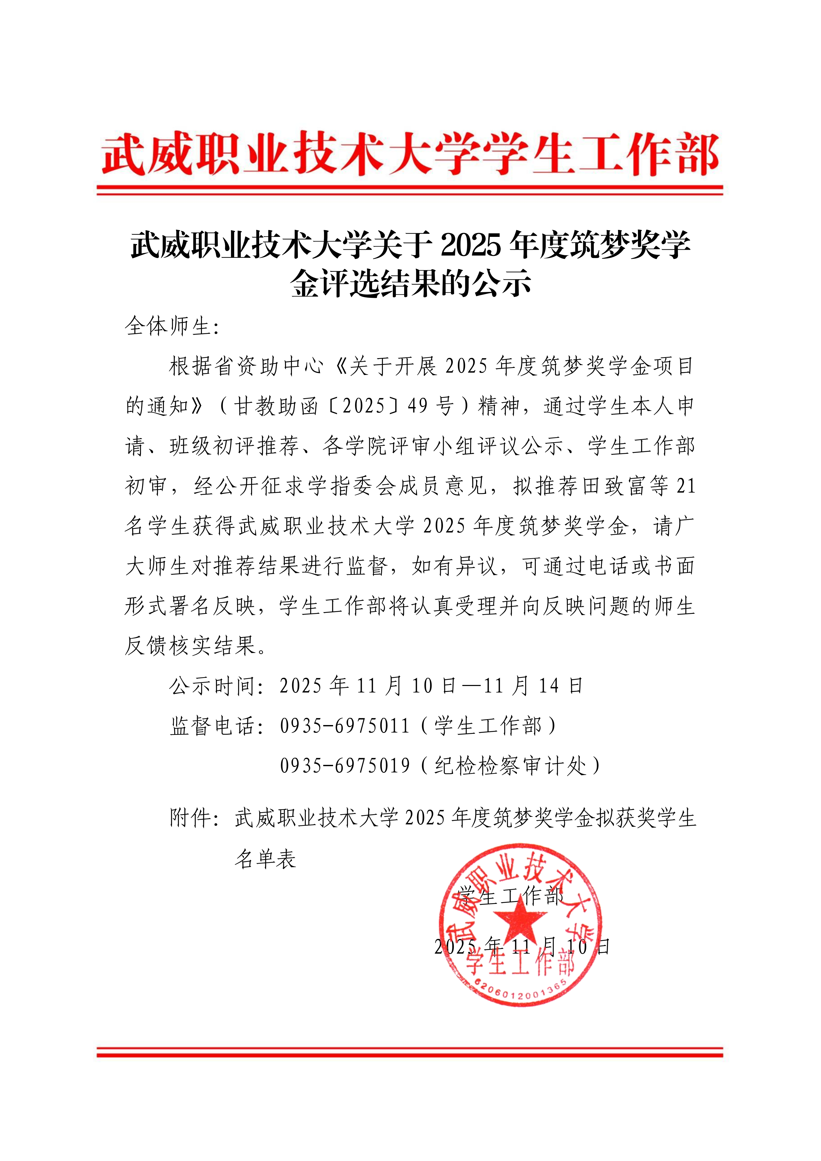 武威職業(yè)技術大學關于2025年度筑夢獎學金評選結(jié)果的公示
