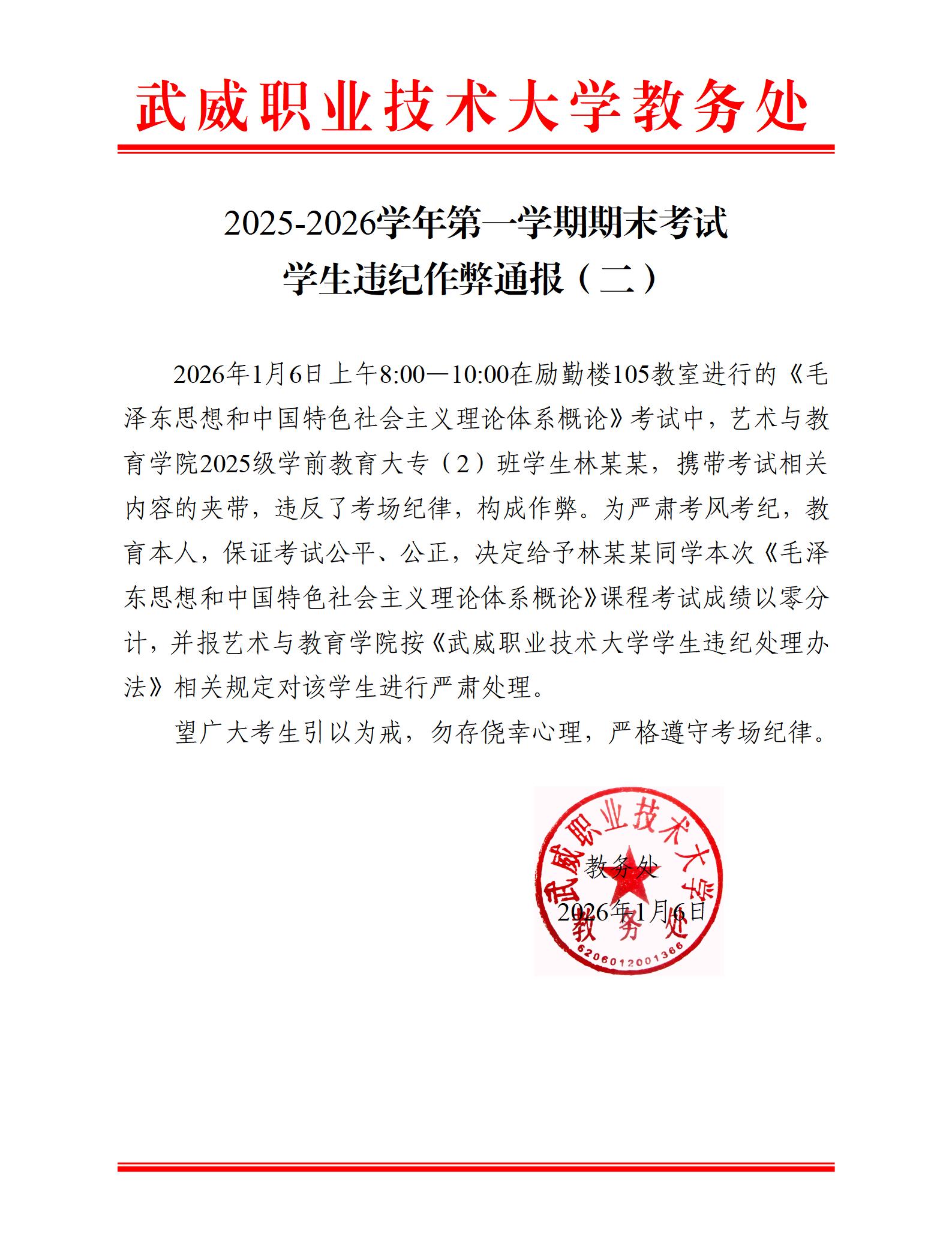 2025-2026學年第一學期期末考試學生違紀作弊通報(六)