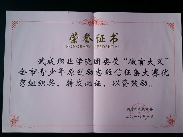 近日,由武威團(tuán)市委舉辦的武威市“微言大義”青少年原創(chuàng)勵(lì)志短信征集大賽圓滿結(jié)束,我院郝金秀同學(xué)榮獲一等獎(jiǎng),李志強(qiáng)、于婷等4名同學(xué)榮獲二等獎(jiǎng),尉杰靈、陳對(duì)麗等3名同學(xué)榮獲三等獎(jiǎng),羅曉飛、楊彩玲等7名同學(xué)榮獲優(yōu)秀獎(jiǎng),學(xué)院團(tuán)委榮獲優(yōu)秀組織獎(jiǎng)。