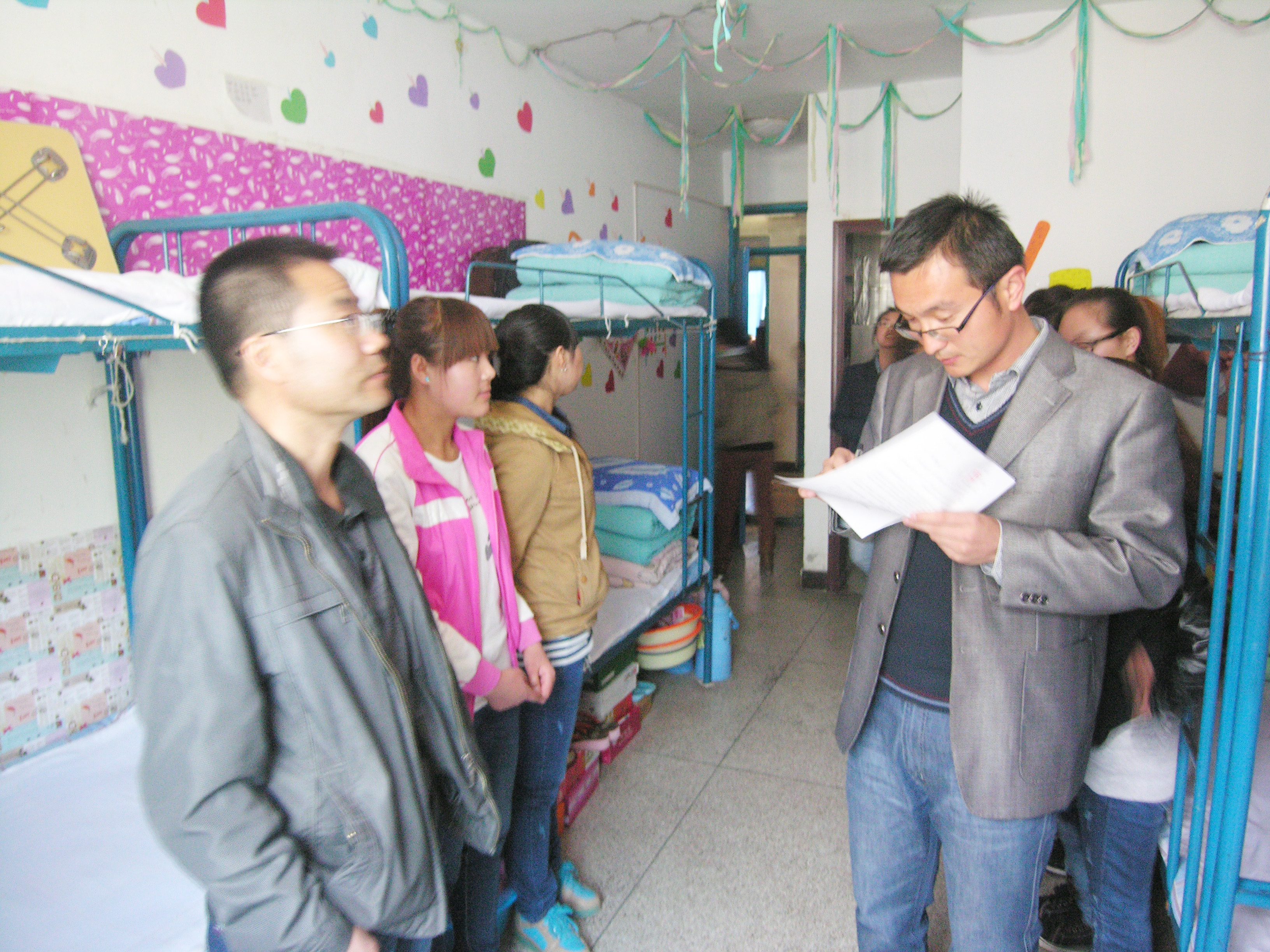 4月11日下午進(jìn)行了集中檢查評比,系黨總支書記張伯成、輔導(dǎo)員、各班主任及學(xué)生會干部擔(dān)任評委。本次活動從講安全、講紀(jì)律、講衛(wèi)生、講文明禮貌等幾個(gè)方面進(jìn)行檢查評比,通過評選2-302、4-429、4-228等十間宿舍被評為文明宿舍。