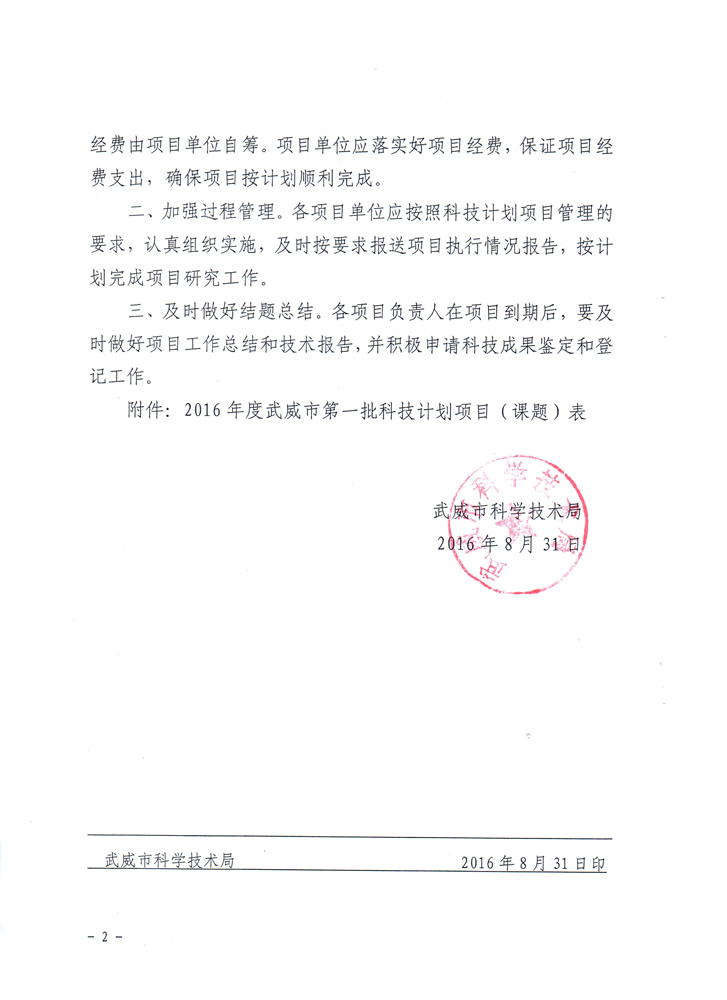武威市科學技術(shù)局關(guān)于下達2016年度武威市第一批科技計劃項目的通知