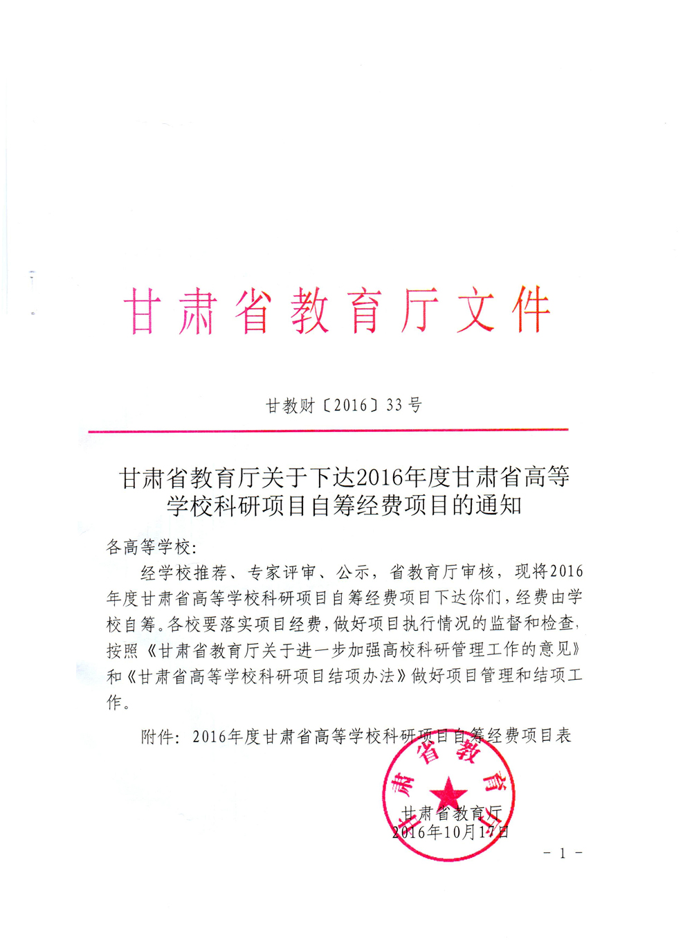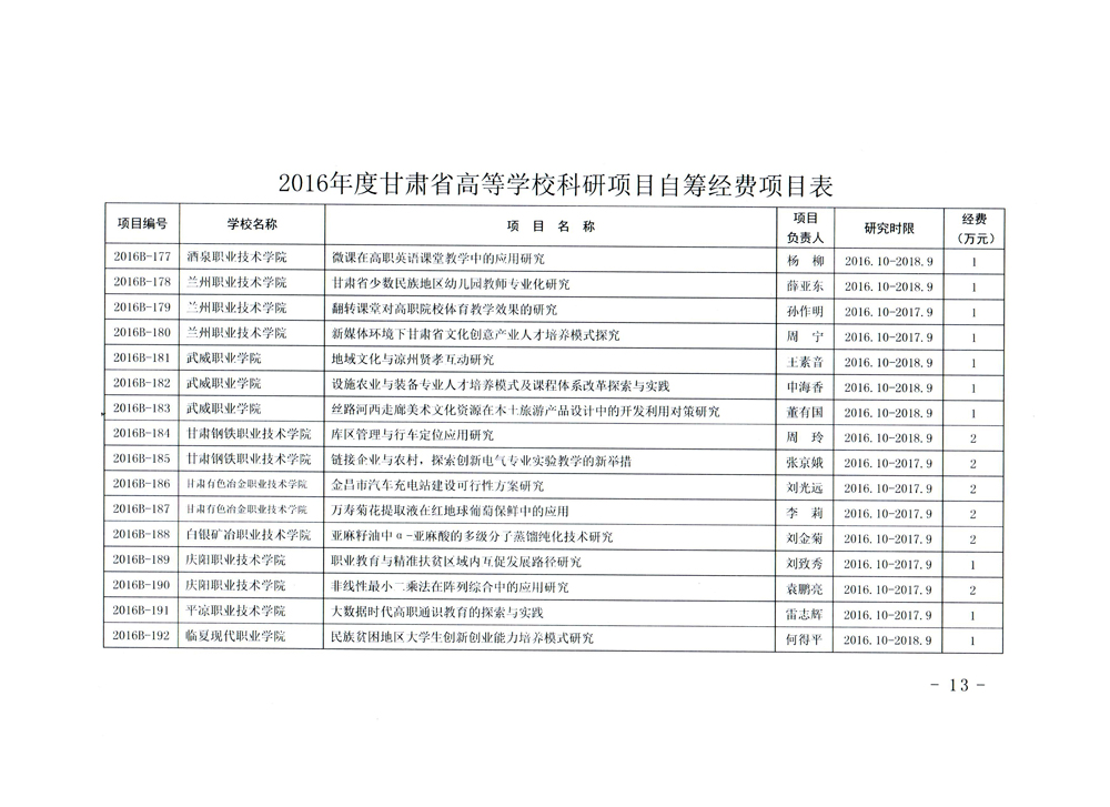 甘肅省教育廳關(guān)于下達(dá)2016年度甘肅省高等學(xué)??蒲许椖孔曰I經(jīng)費(fèi)項目的通知