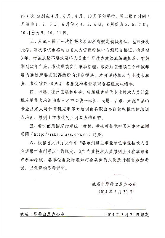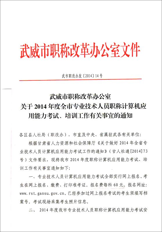 <轉(zhuǎn)>武威市職稱改革辦公室關(guān)于2014年度全市專業(yè)技術(shù)人員職稱計算機應(yīng)用能力考試、培訓(xùn)工作有關(guān)事宜的通知