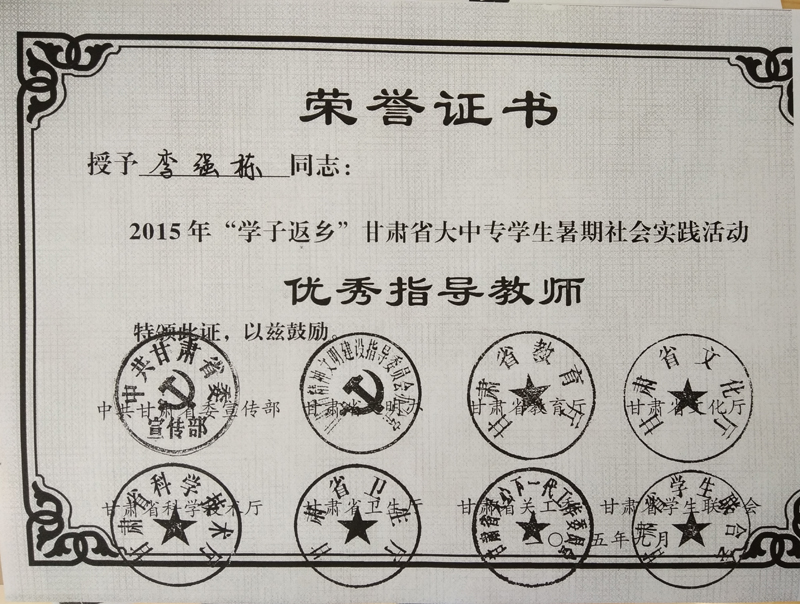李強(qiáng)棟榮獲2015年“學(xué)子返鄉(xiāng)”甘肅省大中專學(xué)生暑期社會(huì)實(shí)踐活動(dòng)優(yōu)秀指導(dǎo)教師