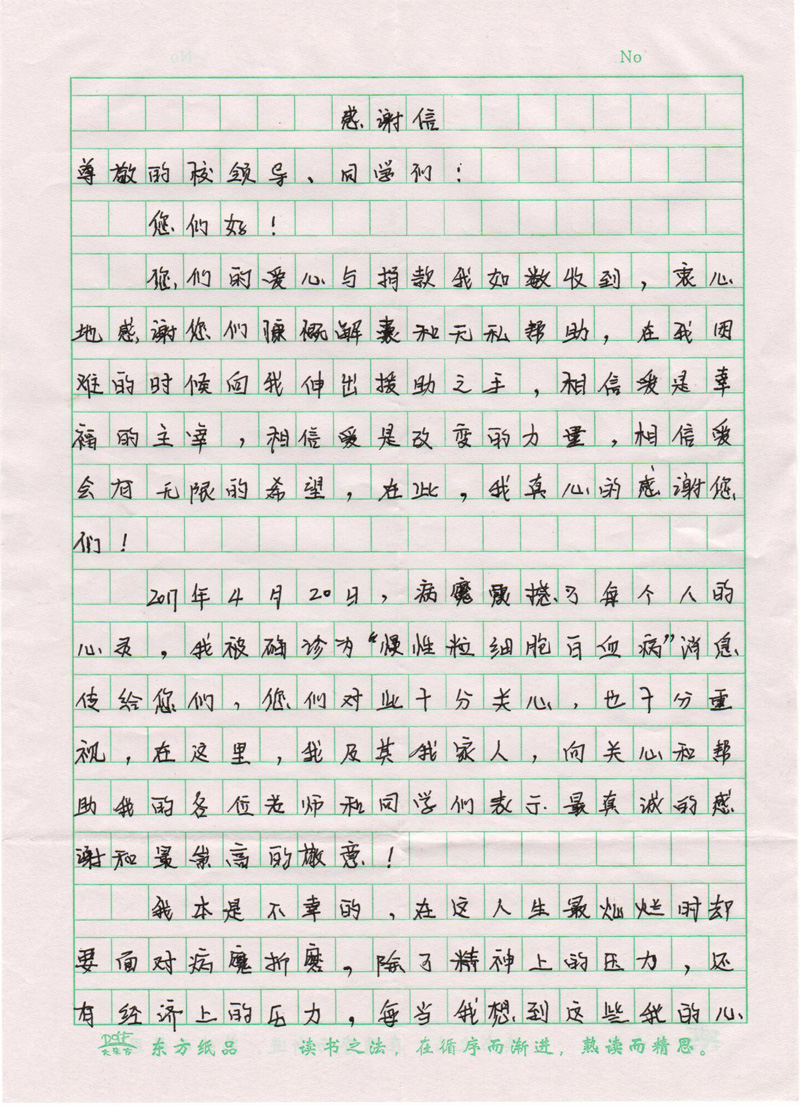 高國(guó)棟是我院機(jī)械制造系2015級(jí)機(jī)械設(shè)計(jì)與制造大專班學(xué)生,于2017年4月確診為慢性粒細(xì)胞白血病。得知這一特殊情況后,學(xué)院宣傳統(tǒng)戰(zhàn)部、團(tuán)委、學(xué)生工作處第一時(shí)間向全院廣大師生發(fā)出倡議,號(hào)召大家獻(xiàn)出愛(ài)心,幫助高國(guó)棟同學(xué)度過(guò)難關(guān)。學(xué)院廣大師生紛紛解囊,慷慨相助。目前捐助的善款已經(jīng)交給高國(guó)棟同學(xué)。為此,高國(guó)棟同學(xué)特意寫(xiě)來(lái)感謝信,表達(dá)對(duì)母校廣大師生的感激之情。在此,我們衷心祝愿高國(guó)棟同學(xué)能在困境中迎難而上,樹(shù)立戰(zhàn)勝疾病的信心,爭(zhēng)取早日康復(fù),重返校園。