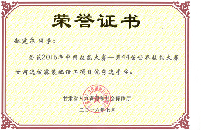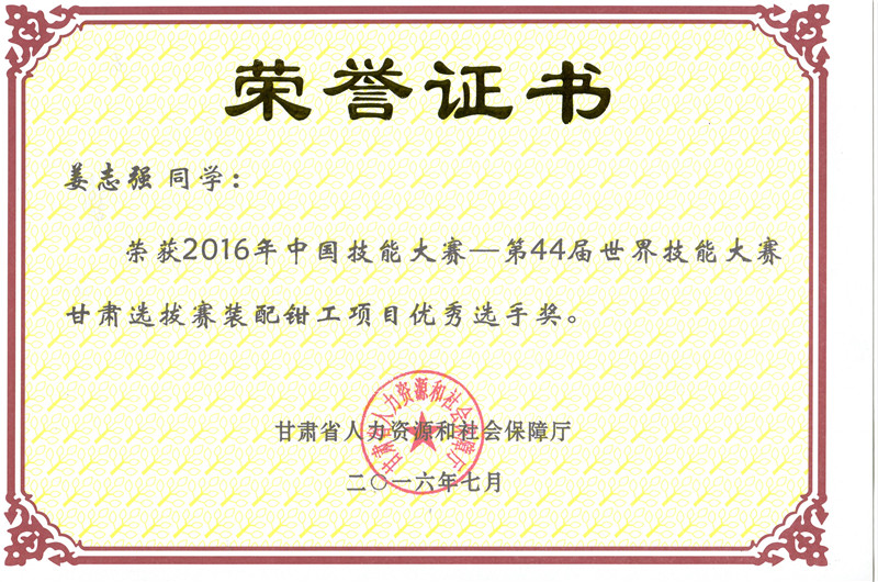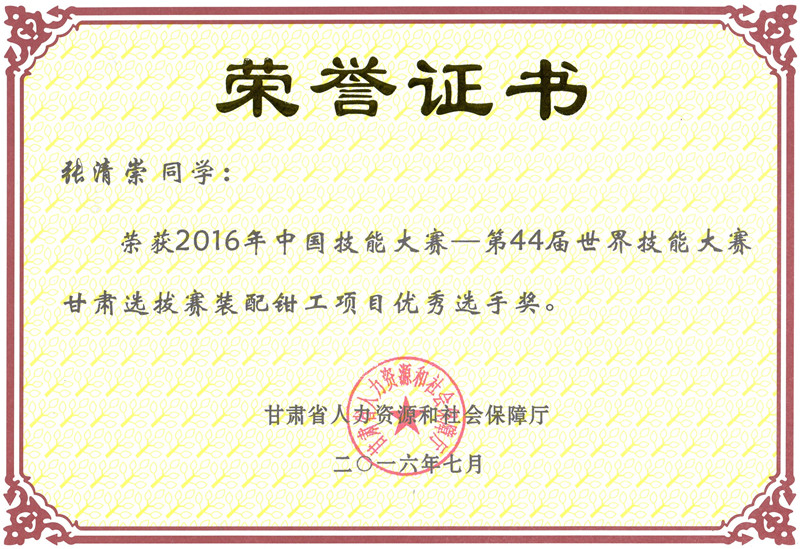 第44屆世界技能大賽甘肅選拔賽裝配鉗工項目優(yōu)秀獎