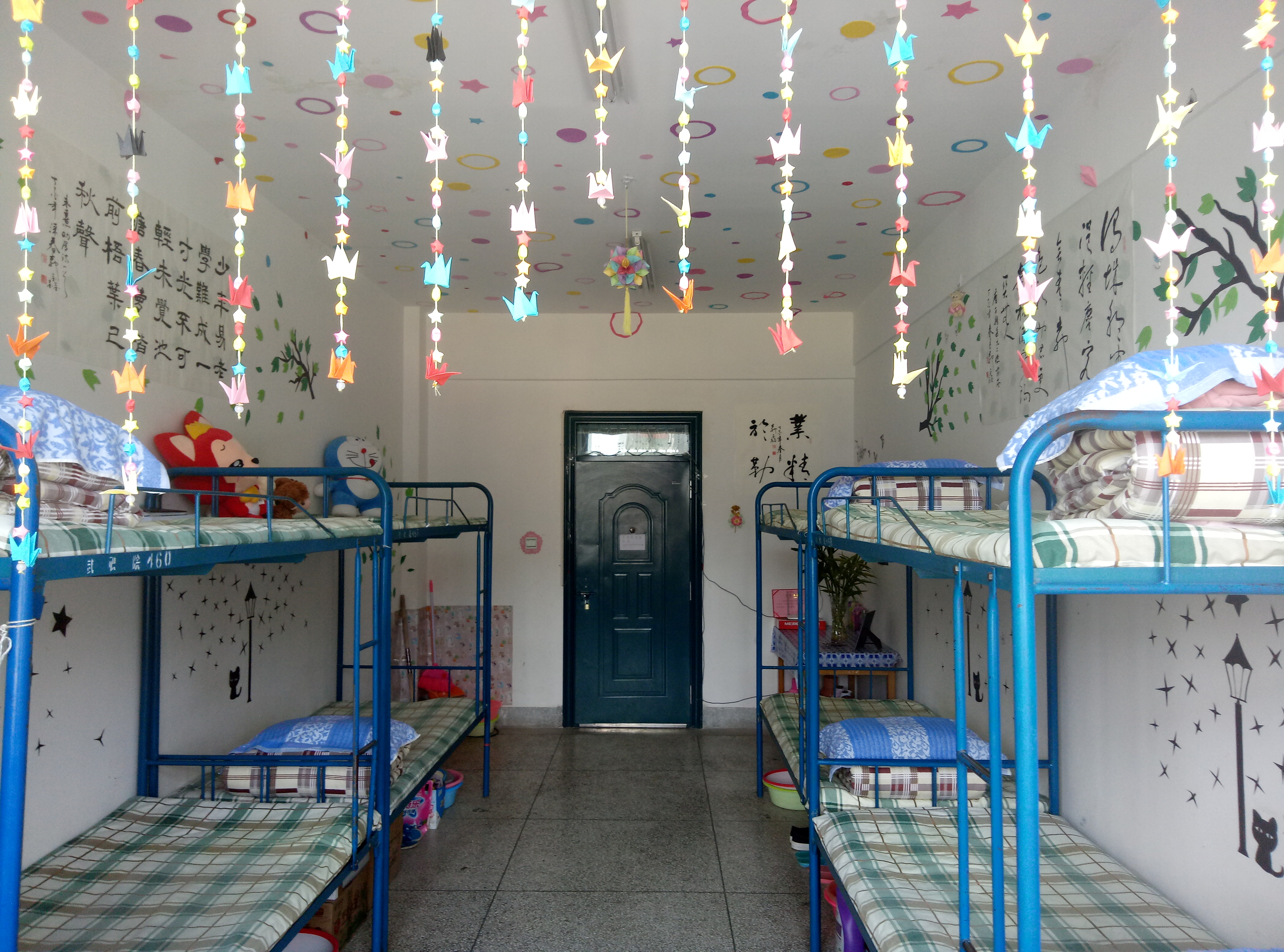 各宿舍衛(wèi)生狀況普遍較好,基本做到了勤開窗,勤掃除,被褥疊放整齊,地面、桌面干凈整潔,用電合理、安全。同學(xué)們大膽創(chuàng)新利用剪紙、剪花、圖貼等手工作品將宿舍裝扮得優(yōu)雅而漂亮。也有同學(xué)用書法、繪畫作品裝扮宿舍,為宿舍增添了藝術(shù)的氣息。
