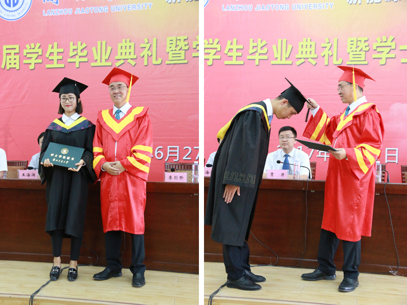 蘭交大教務處副處長王海涌宣讀了關于授予學士學位的決定;學生處處長貢力宣讀了關于表彰2016屆優(yōu)秀畢業(yè)生的決定;校黨委副書記、常務副校長李引珍為2017屆畢業(yè)生代表正冠撥穗并頒發(fā)學位證書;各位領導為畢業(yè)生頒發(fā)了畢業(yè)證書和優(yōu)秀畢業(yè)生榮譽證書。