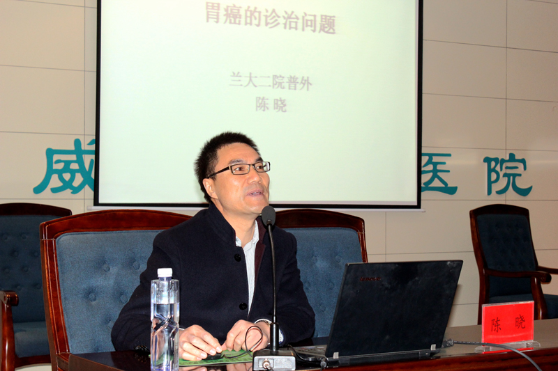 醫(yī)院邀請(qǐng)到蘭州大學(xué)第二醫(yī)院普外三科主任、胃腸外科主任、主任醫(yī)師陳曉和普外二科副主任,副主任醫(yī)師康博雄為大家作學(xué)術(shù)講座。陳曉主講了《胃癌的診治問(wèn)題》,并與大家分享了他在法國(guó)醫(yī)院和美國(guó)醫(yī)院進(jìn)修學(xué)習(xí)時(shí)的一些感想和見聞。陳曉在講座中結(jié)合臨床體會(huì)說(shuō):許多胃癌患者在就診時(shí)已經(jīng)發(fā)展為中晚期,失去了手術(shù)機(jī)會(huì)。他呼吁全社會(huì)要認(rèn)識(shí)到對(duì)胃癌高發(fā)地區(qū)、高危年齡、高危人群進(jìn)行篩查的必要性。醫(yī)生要對(duì)有癥狀的患者及早進(jìn)行胃鏡檢查,爭(zhēng)取做到早發(fā)現(xiàn)、早診斷、早治療。講座中,陳曉就外科手術(shù)吻合方式選擇與直屬附屬醫(yī)院外科主任滕志勇醫(yī)生進(jìn)行了現(xiàn)場(chǎng)互動(dòng)。