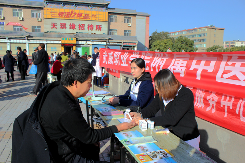 11 月1,為配合2017年甘肅衛(wèi)生計(jì)生題材劇目秦腔《皇甫謐》在武威成功上演,根據(jù)市衛(wèi)生計(jì)生委安排,直屬附屬醫(yī)院派出醫(yī)生李生海、護(hù)士許海燕等醫(yī)務(wù)人員組成的醫(yī)療小分隊(duì),與其他10余家醫(yī)療衛(wèi)生單位的醫(yī)務(wù)人員一道,在武威南城門廣場(chǎng)開(kāi)展便民義診服務(wù)活動(dòng)。