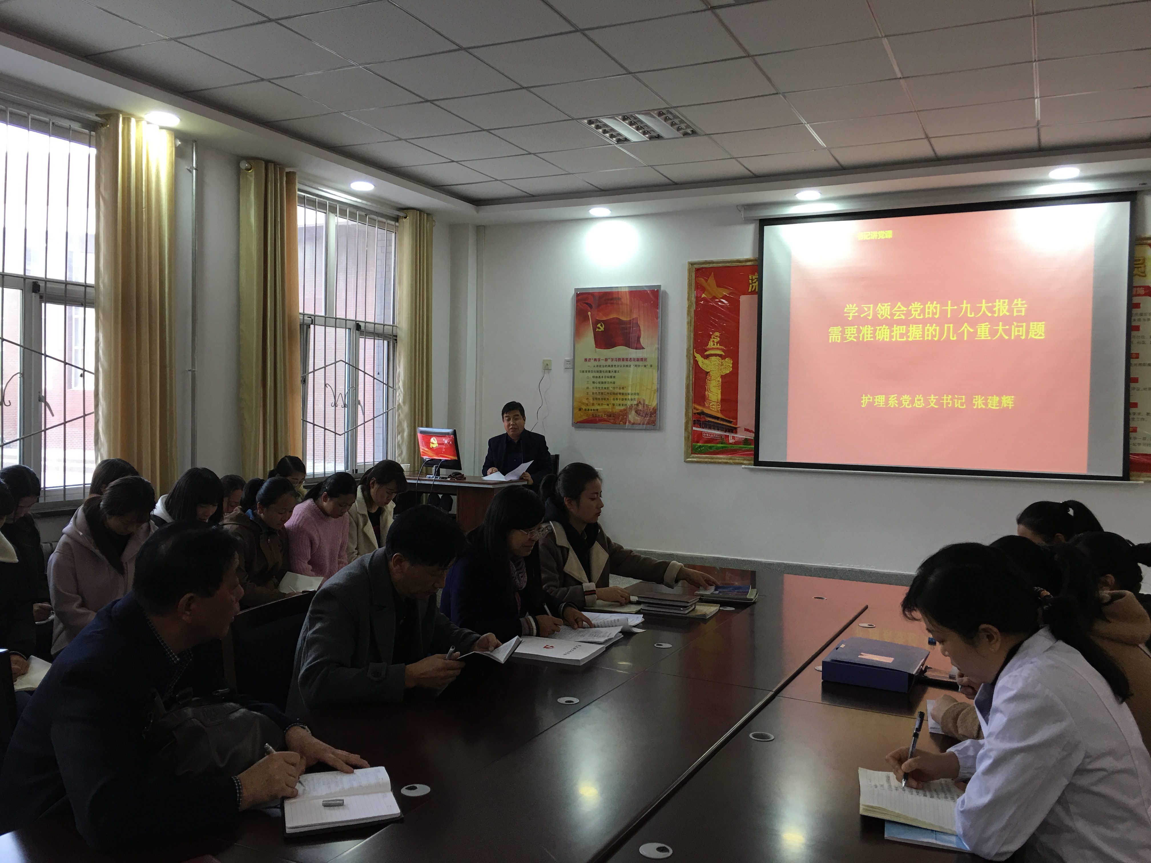 11月17日,護理系黨支部支召開全體黨員大會,黨總支書記張建輝講黨課,就《學習領會黨的十九大報告需要準確把握的幾個重大問題》進行專題黨課輔導,促進全體黨員對十九大精神的學習理解。護理系入黨積極分子聆聽了黨課。
